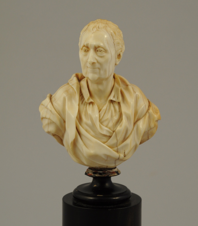 Buste en ivoire sculpté en ronde bosse représentant l'auteur de l'Esprit des lois. Signé en dessous "ROSSET PÈRE F", "AST CLAUDE" et daté 1769.