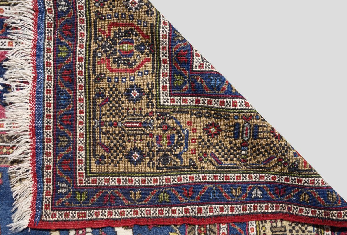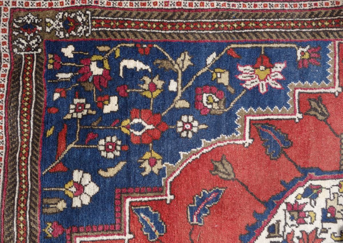 ASIE MINEURE. TAPIS d'Orient en laine à décor floral. Médaillon central losangique blanc et bleu sur fond rouge. Quatre écoinçons. Bordure crème.