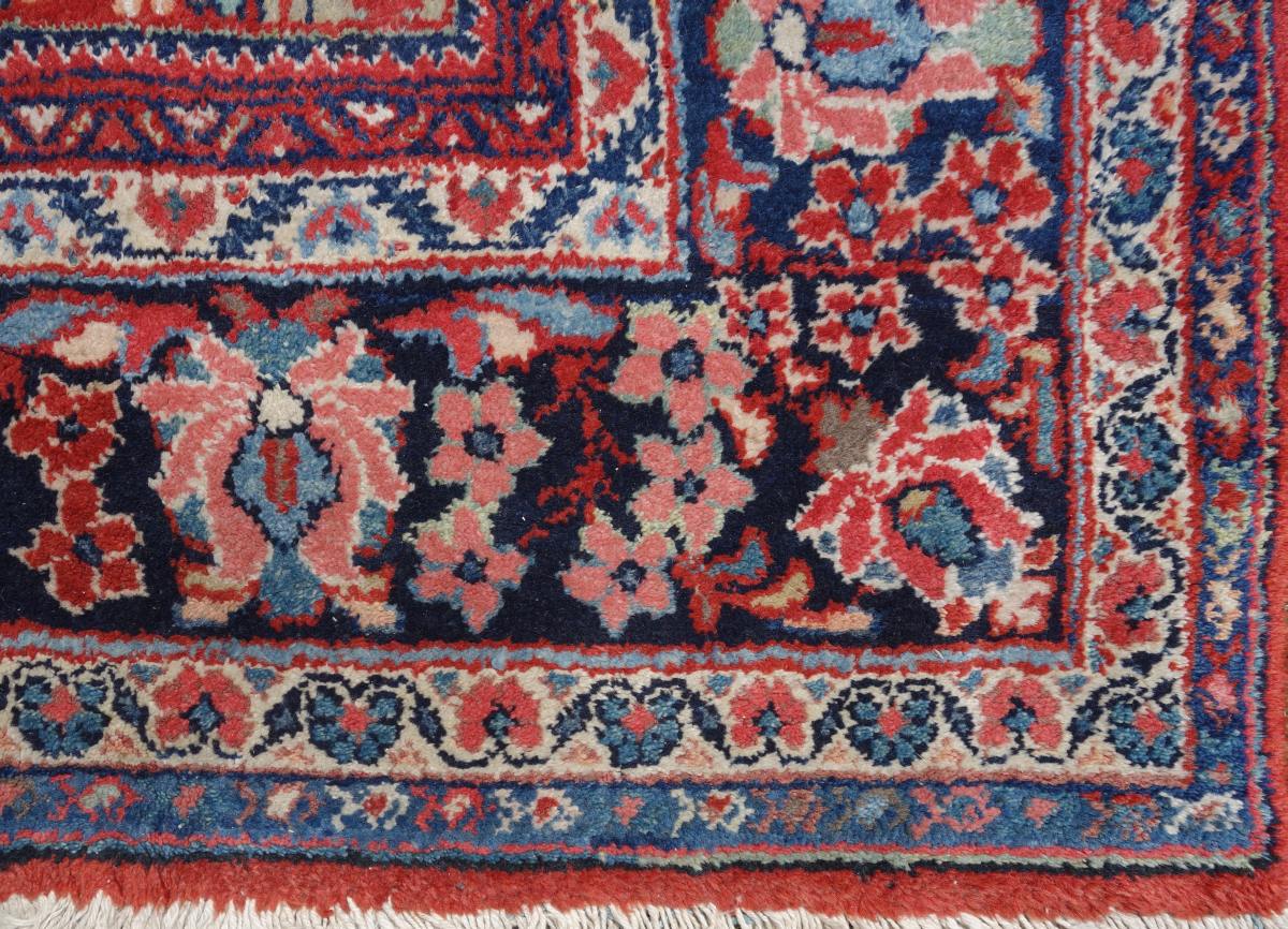 MAHAL. TAPIS en laine à fond rouge orné d'un décor floral. Bordure sur fond bleu à frise fleurie.