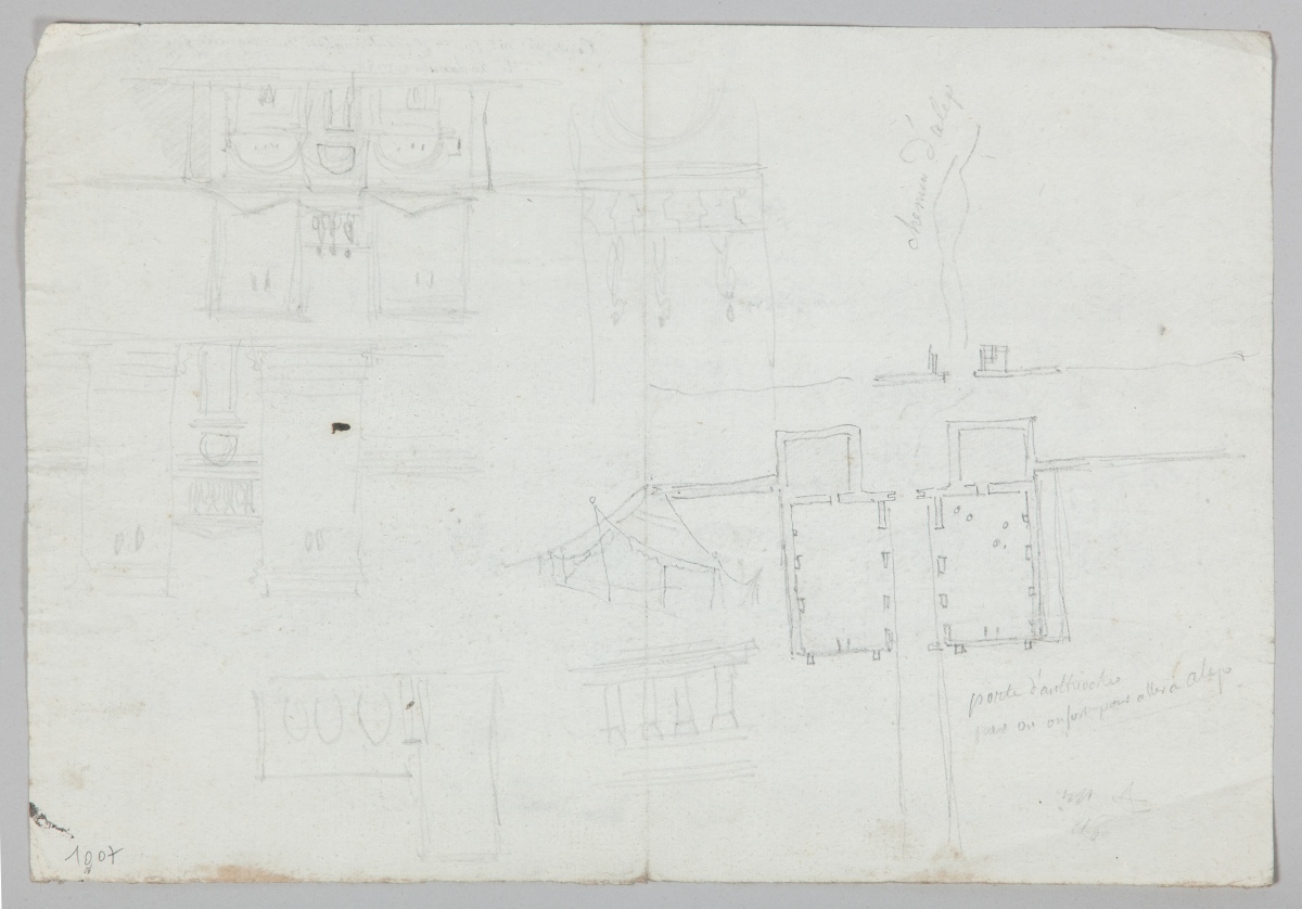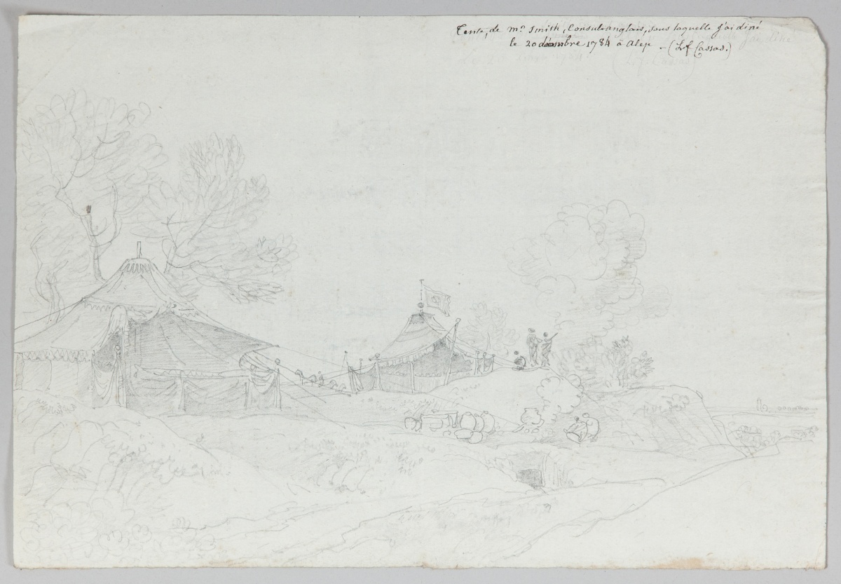 Légendé à la plume et encre noire sur traits de crayon noir en haut à droite : "Tente de Monsieur Smith, consul anglais, sous laquelle j 'ai dîné, le 20 décembre 1784 à Alep. (L.F.Cassas)" et au verso "porte d'Antioche (