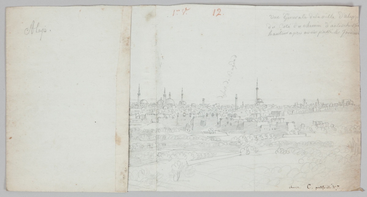 - "Vue générale de la ville d'Alep prise du côté du chemin d'Antioche sur la hauteur après avoir passé les jardins".