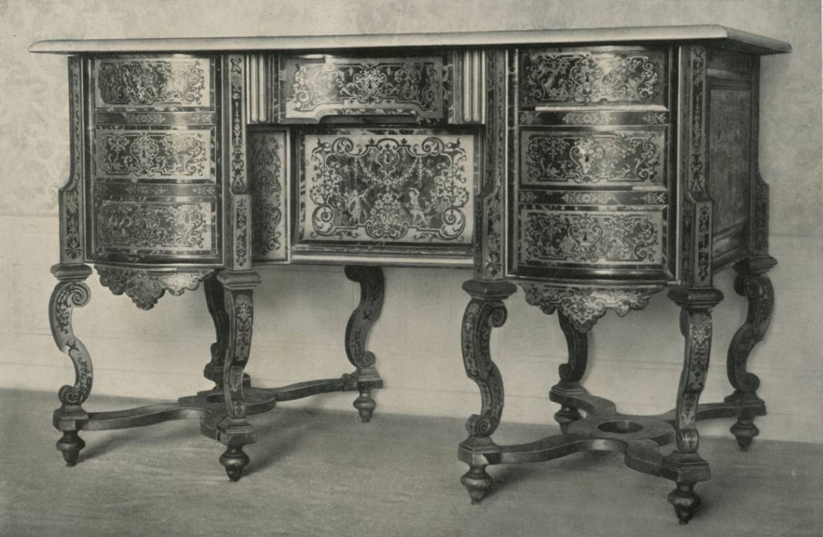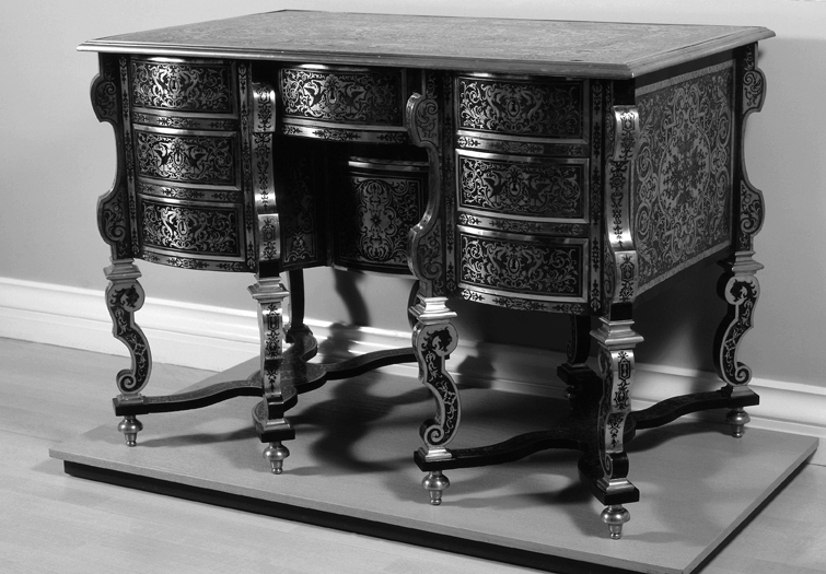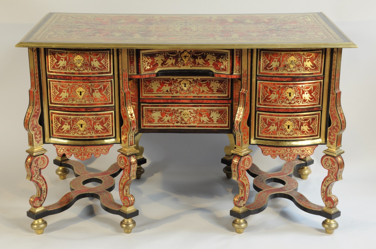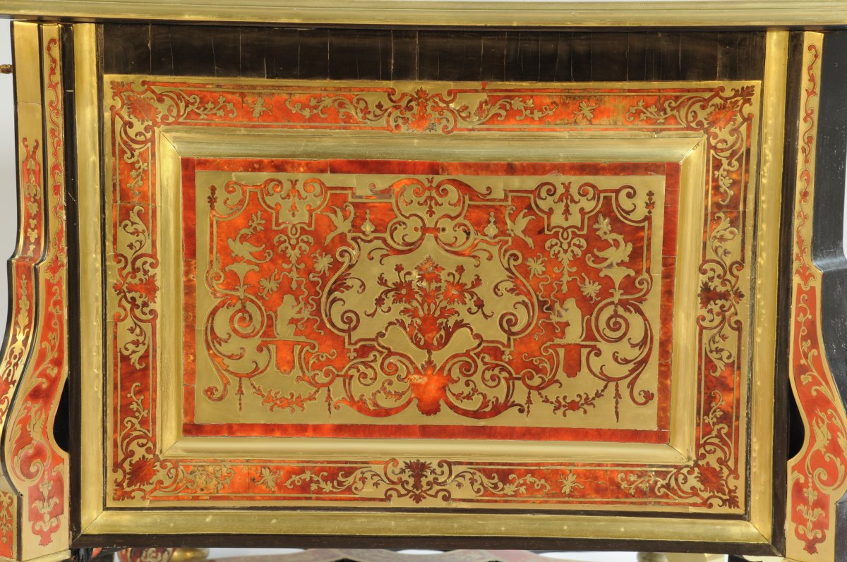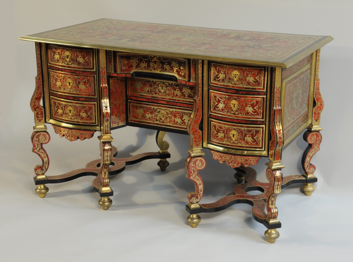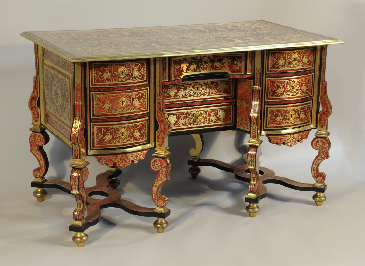 La technique de la marqueterie dite " Boulle ", ainsi que les motifs dits " à la Bérain " dominent l'ébénisterie parisienne de la fin du règne de Louis XIV. Le décor de notre bureau est sans conteste inspiré des projets d'ornement de Jean Ier Bérain. Bien que ne reproduisant pas fidèlement l'un d'entre eux, nous retrouvons figuré, sur une gravure conservée au Musée des arts décoratifs, le magot, assis sous un dais, du centre du plateau ainsi que les deux chimères affrontées. Plusieurs ateliers de marqueteurs sont alors associés aux ébénistes, leurs fournissant les panneaux nécessaires à la réalisation de divers meubles.