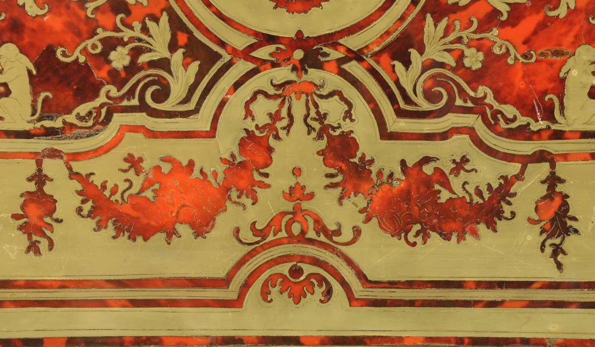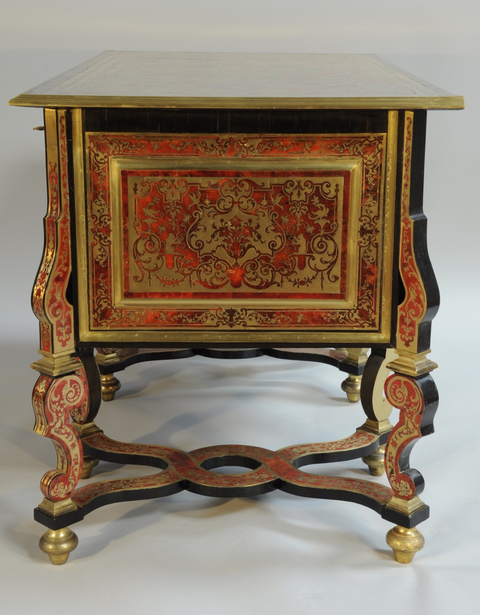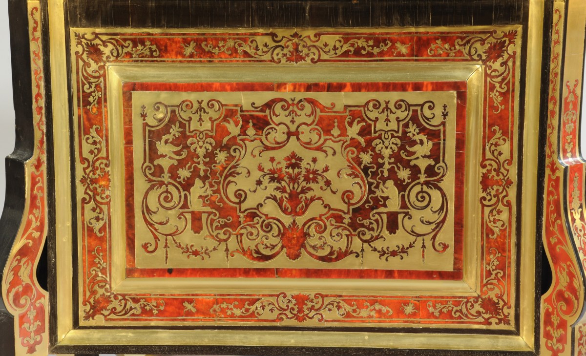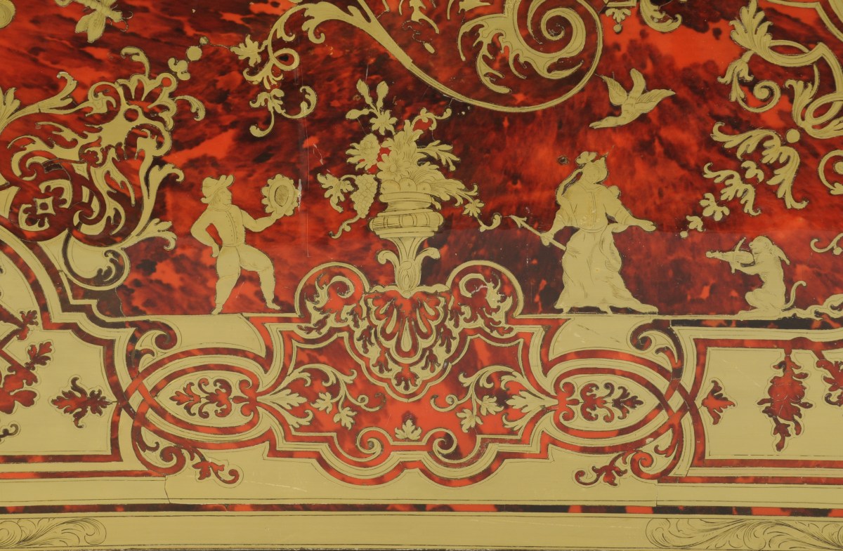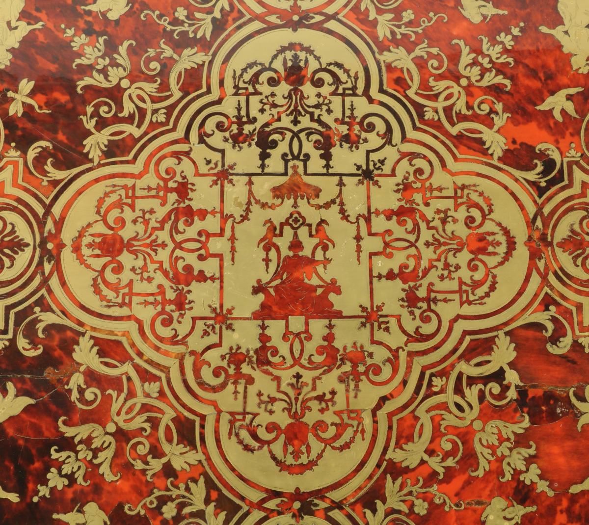 La technique de la marqueterie dite " Boulle ", ainsi que les motifs dits " à la Bérain " dominent l'ébénisterie parisienne de la fin du règne de Louis XIV. Le décor de notre bureau est sans conteste inspiré des projets d'ornement de Jean Ier Bérain. Bien que ne reproduisant pas fidèlement l'un d'entre eux, nous retrouvons figuré, sur une gravure conservée au Musée des arts décoratifs, le magot, assis sous un dais, du centre du plateau ainsi que les deux chimères affrontées. Plusieurs ateliers de marqueteurs sont alors associés aux ébénistes, leurs fournissant les panneaux nécessaires à la réalisation de divers meubles.