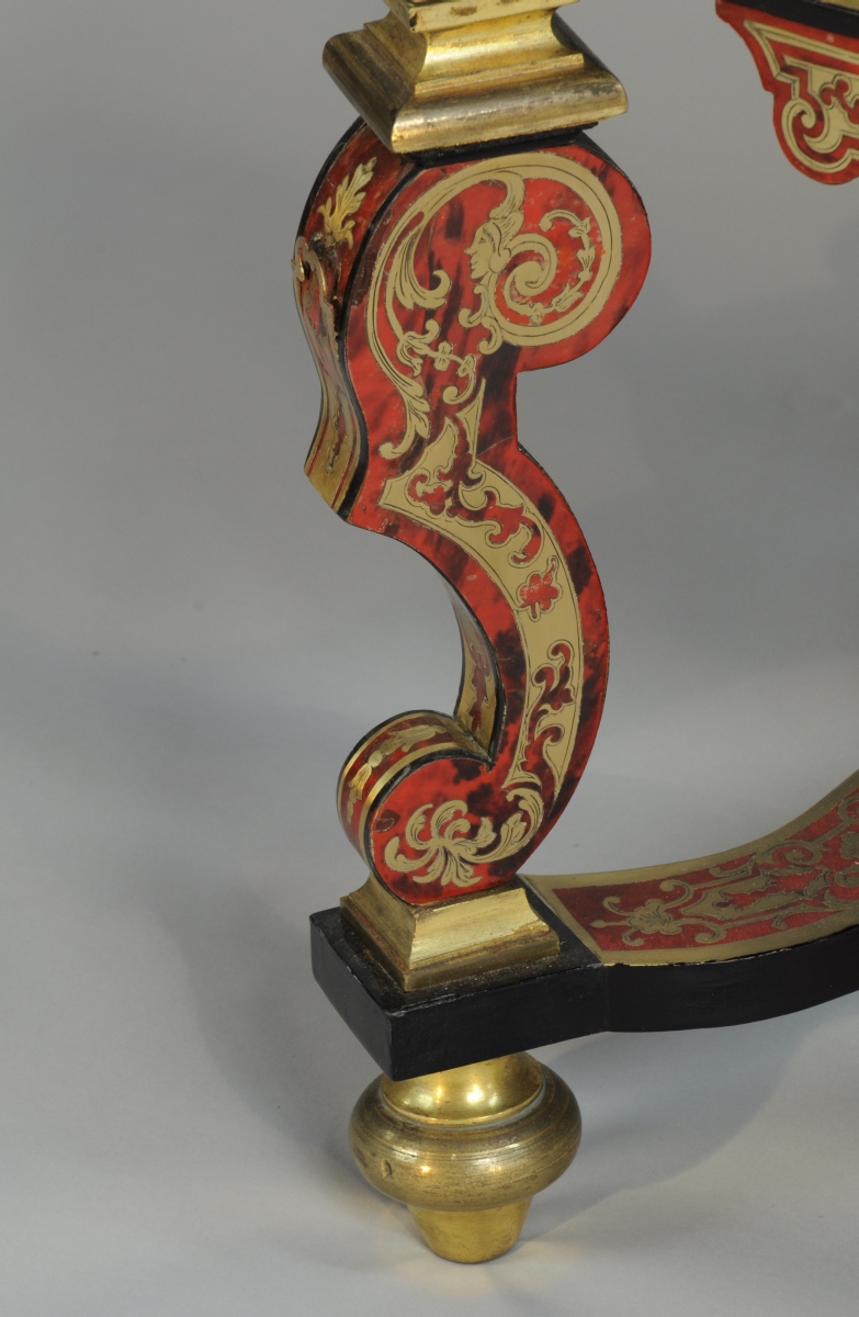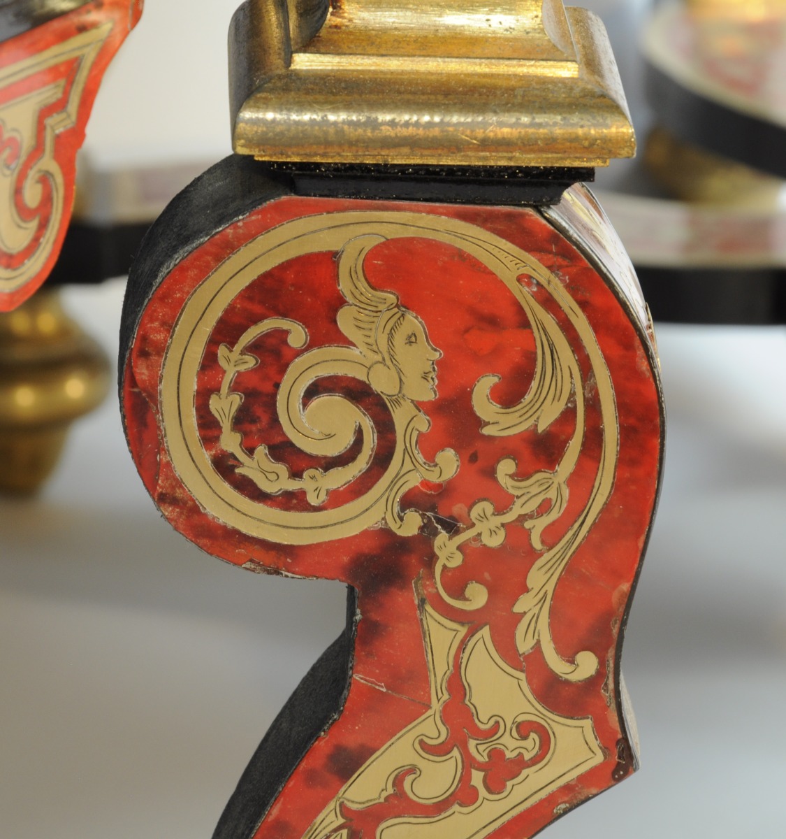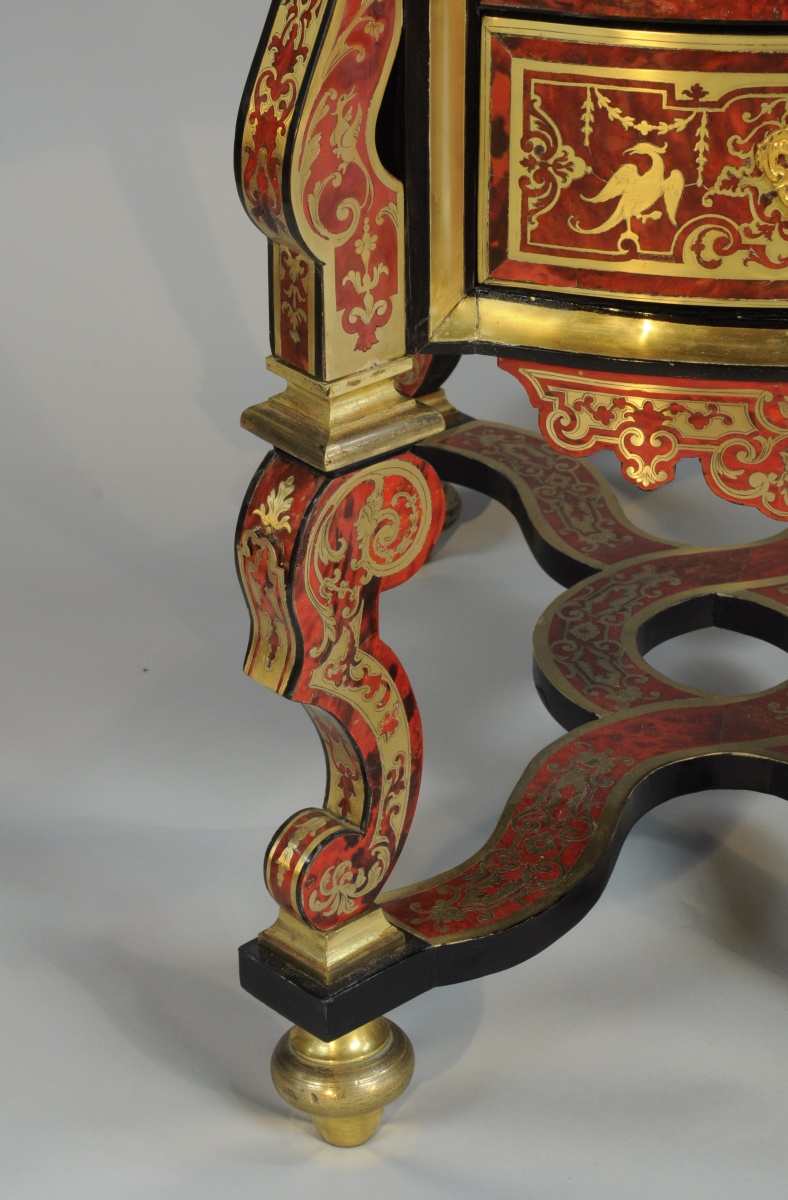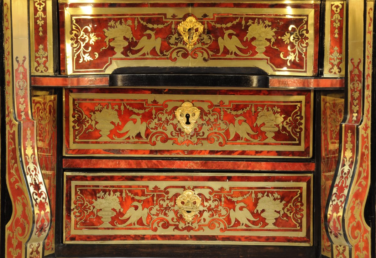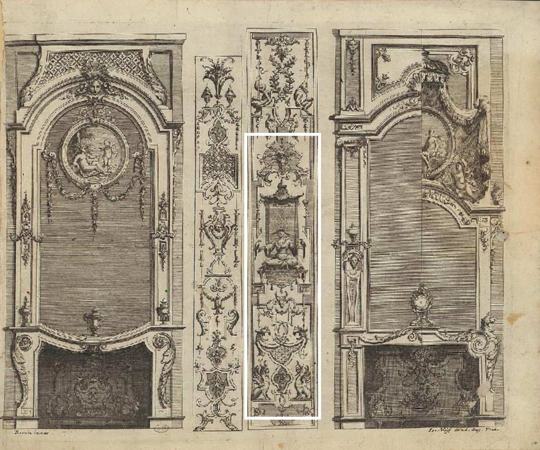 La technique de la marqueterie dite " Boulle ", ainsi que les motifs dits " à la Bérain " dominent l'ébénisterie parisienne de la fin du règne de Louis XIV. Le décor de notre bureau est sans conteste inspiré des projets d'ornement de Jean Ier Bérain. Bien que ne reproduisant pas fidèlement l'un d'entre eux, nous retrouvons figuré, sur une gravure conservée au Musée des arts décoratifs, le magot, assis sous un dais, du centre du plateau ainsi que les deux chimères affrontées. Plusieurs ateliers de marqueteurs sont alors associés aux ébénistes, leurs fournissant les panneaux nécessaires à la réalisation de divers meubles.
