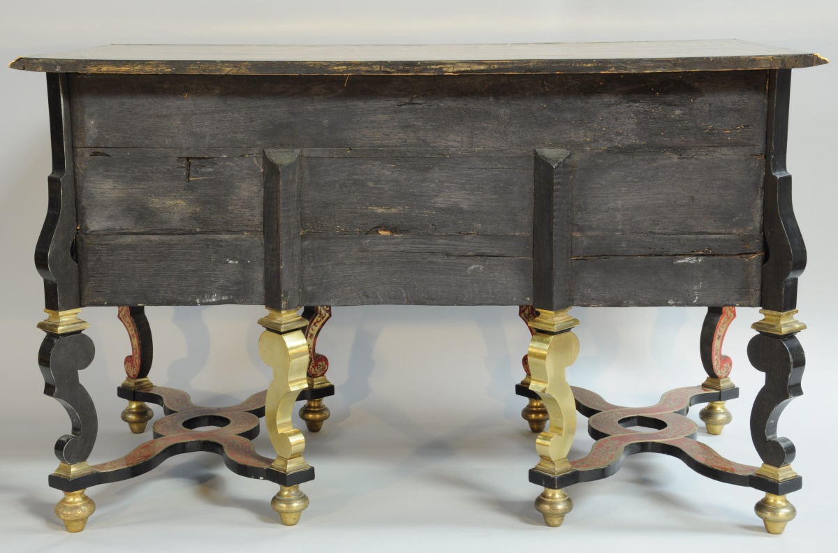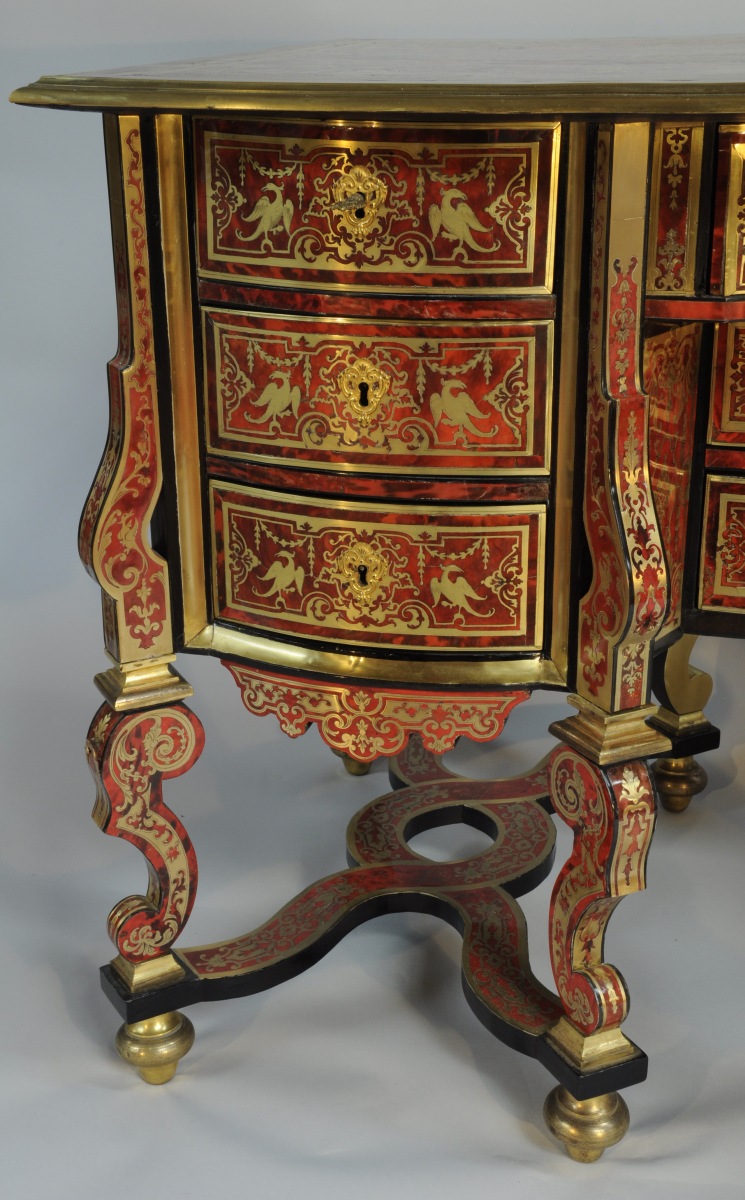 BUREAU dit MAZARIN en marquetterie d'écaille et de laiton sur 3 faces, ouvrant à neuf tiroirs sur trois rangs et reposant sur huit pieds à consoles inversées, terminés par des toupies, réunis par deux entretoises . Riche décor floral et géométrique de phénix sur les quatre faces et sur le plateau, lui-même ceint d'une lingotière.