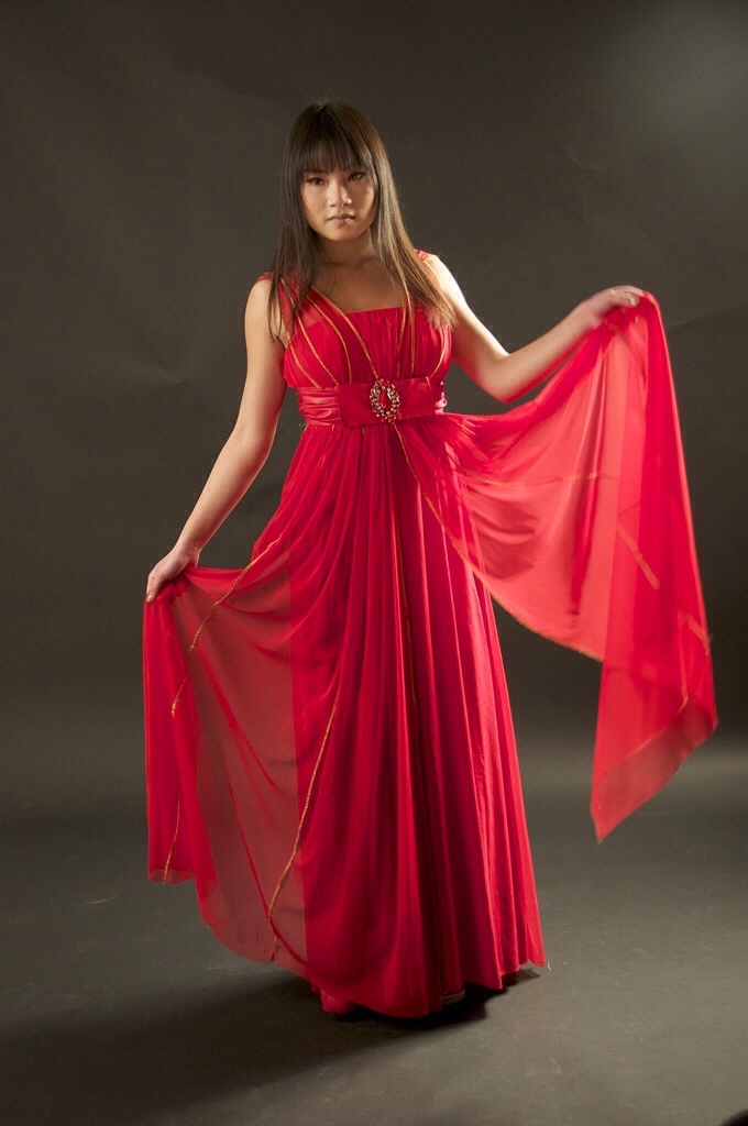 Robe longue rouge, à plusieurs drapés.