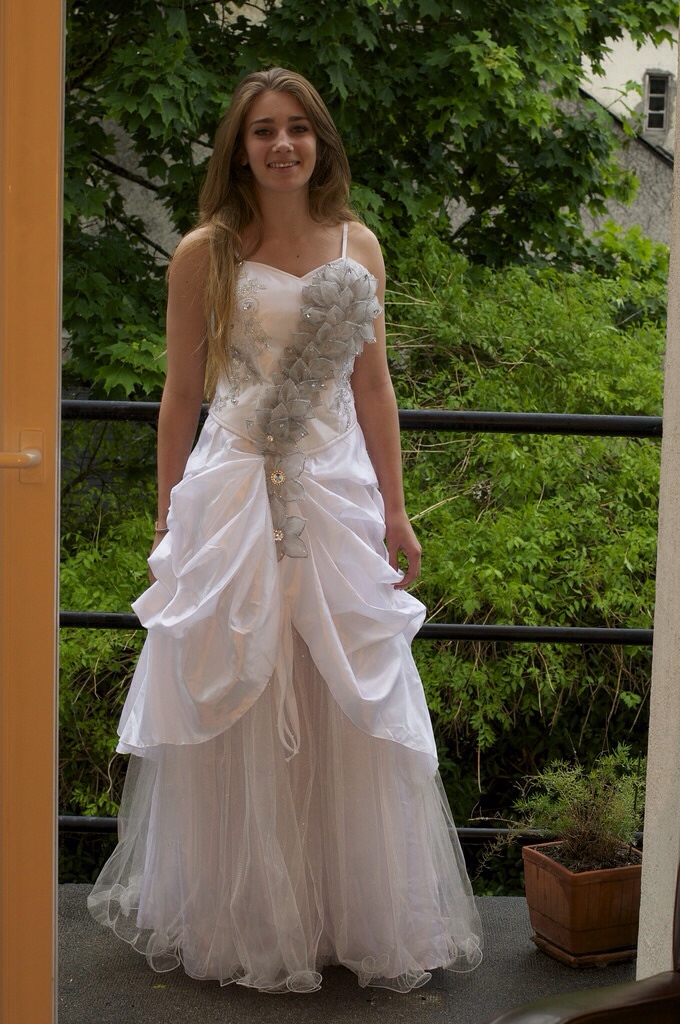 Robe de mariée fleur à bustier et jupons.