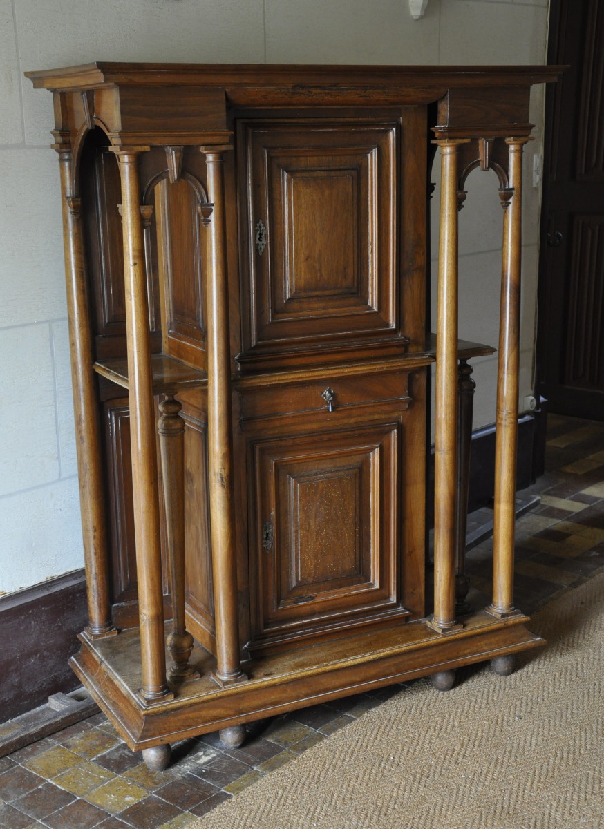 CRÉDENCE en noyer mouluré présentant une partie centrale ouvrant à deux vantaux et un tiroir, deux plateaux latéraux sur un pied fuselé et tourné, et encadré par des montants à colonnes réunis par des traverses en arcature surmontées par une corniche moulurée.