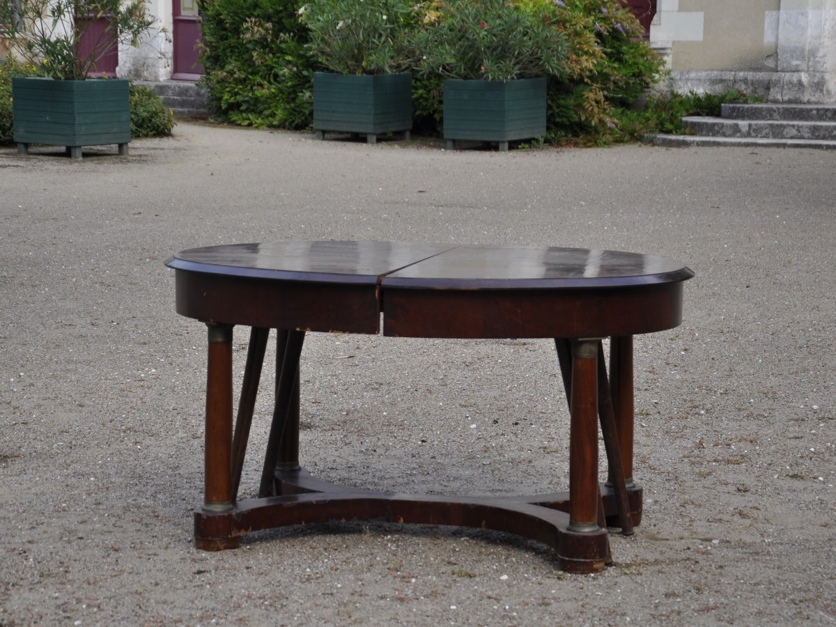 TABLE de salle à manger, en acajou et placage d'acajou; plateau ovale sur quatre pieds de forme colonne réunis par une entretoise en X.
