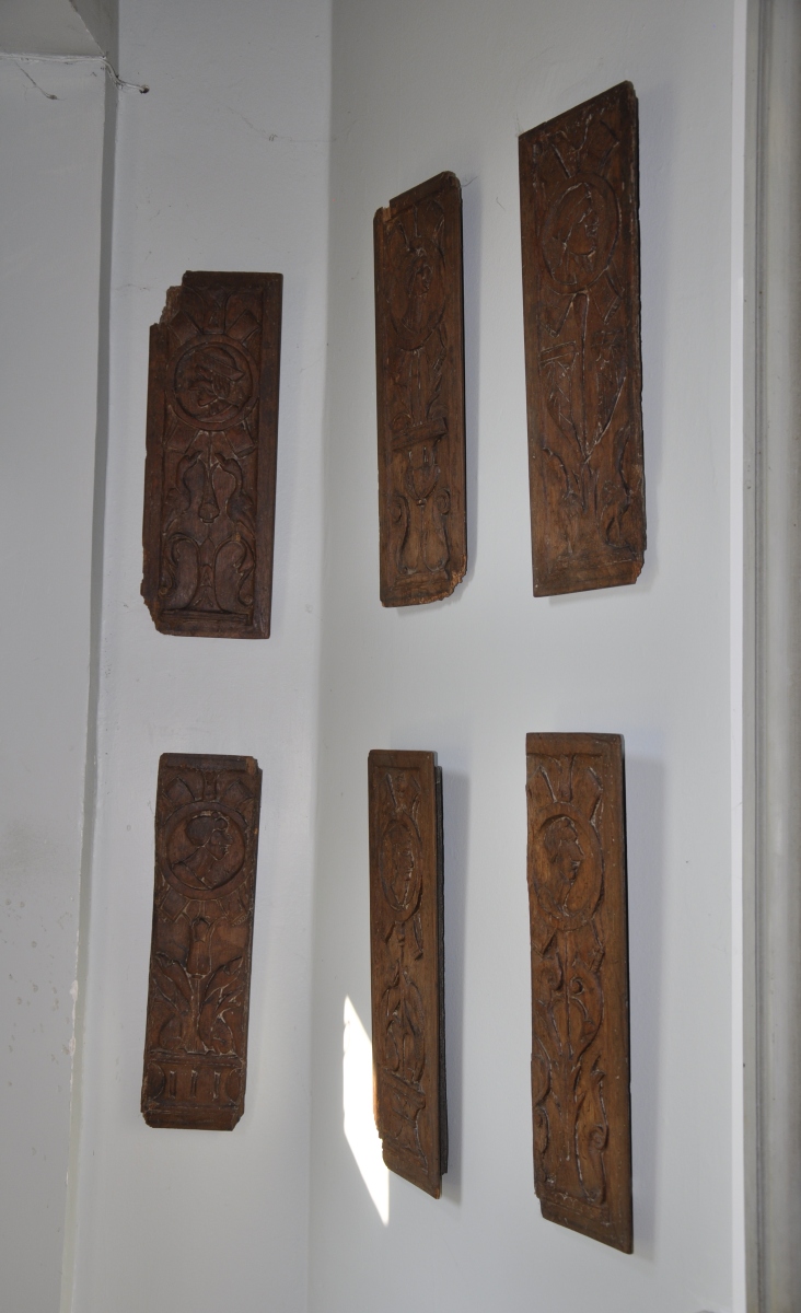 Six petits PANNEAUX anciens en chêne sculpté de têtes de personnages et de rinceaux.