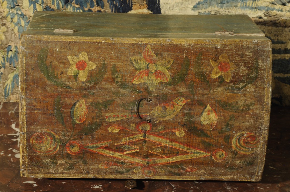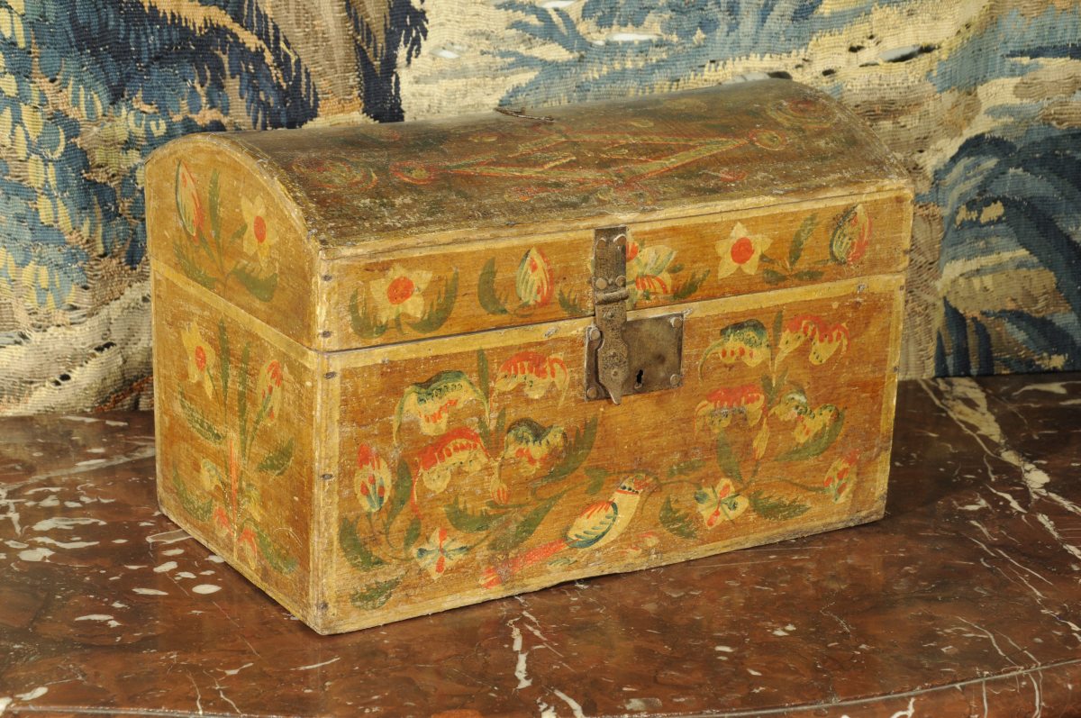 PETIT COFFRE en bois peint dit "coffre de mariée", couvercle bombé, décor de fleurs.