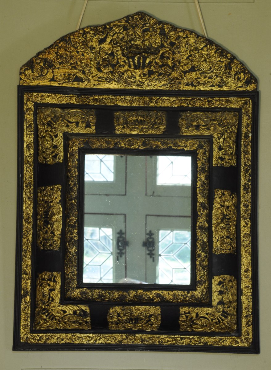 GLACE à encadrement à fronton, en bois mouluré et noirci à garniture de plaques en cuivre repoussé à décor de rinceaux feuillagés.