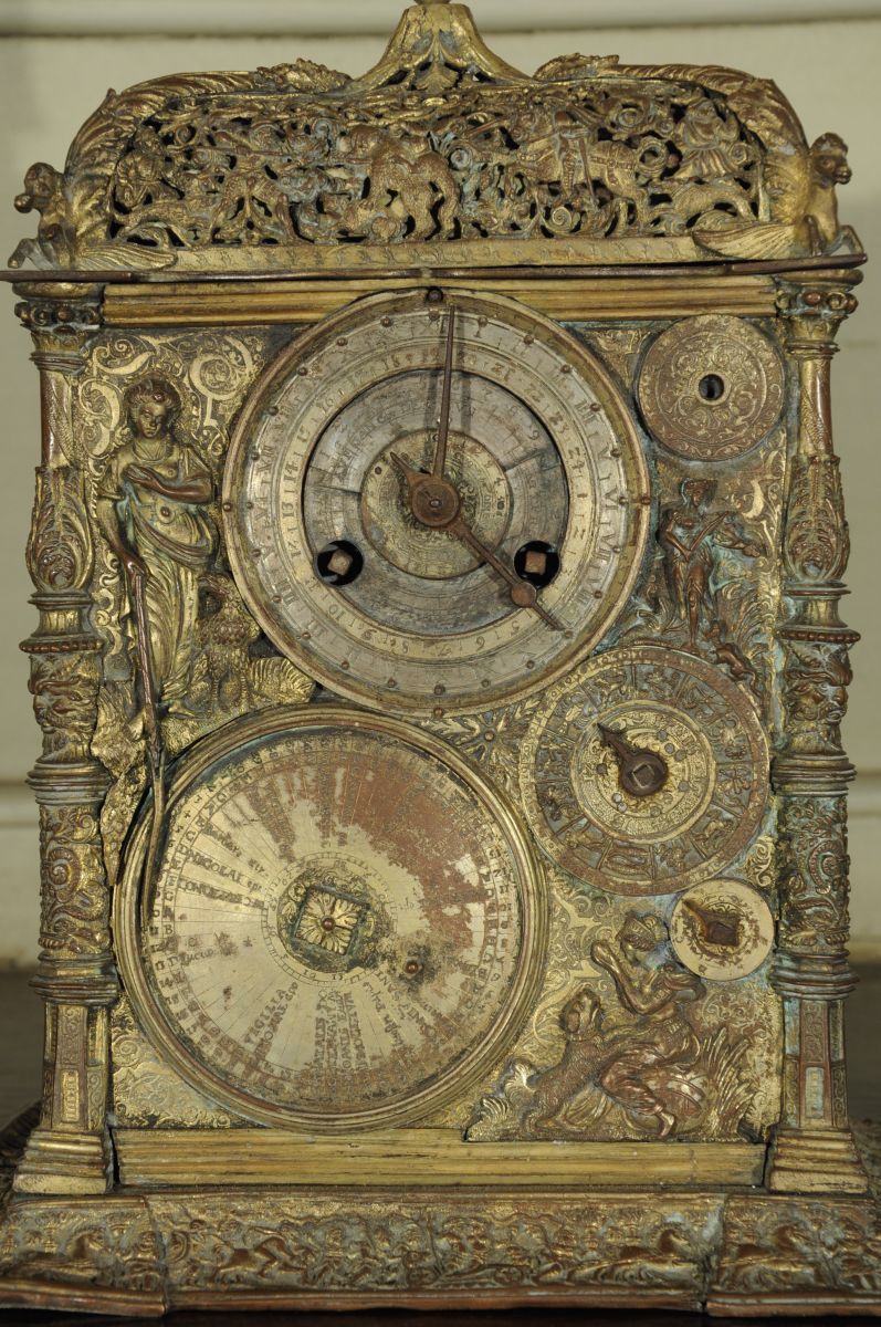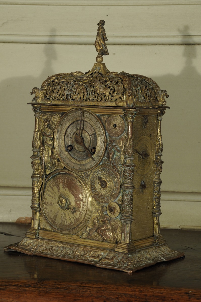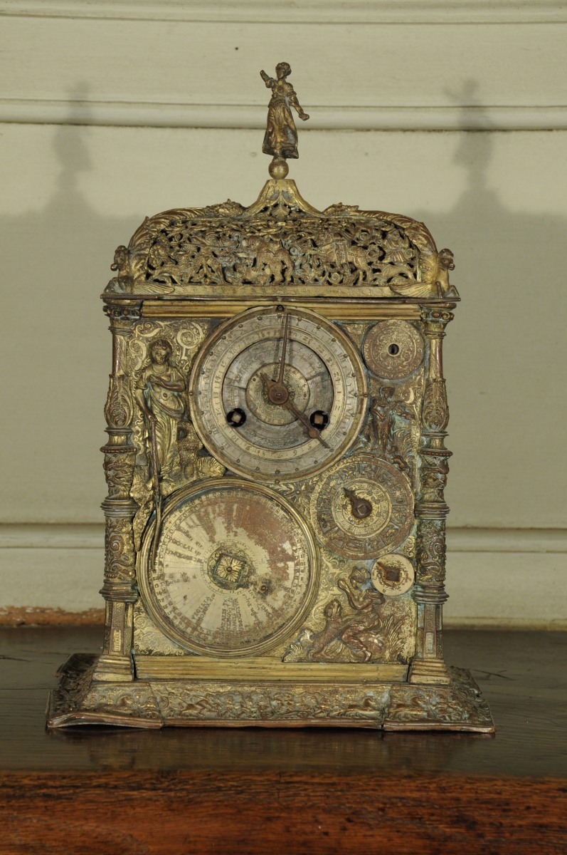 HORLOGE DE TABLE ASTRONOMIQUE de forme rectangulaire en galvanoplastie à décor ajouré et gravé de scène à l'Antique. Base évasée à décor en frise de scènes de procession. Montants latéraux à pilastres ornés de rinceaux, grotesques, volutes et serpents. Reliefs rapportés figurant une allégorie du Temps avec sa faux, des jeunes femmes à la musique, à l'escargot, au chien et au singe. Datée sur le côté 1562, située et signée " Ovrmacher O in O Augspur " et " O Eremias o u Metskea Ovrma ". Gravée de deux textes en latin signifiant : " Au début tu apprendras pendant des années de maison de maître en maison de maître : tu chercheras le nombre d'or, par les sciences et ensuite les lettres par la littérature ". Mascarons, dont deux figurant Jupiter soufflant le vent. Partie supérieure à quatre pans ajourés d'un riche décor de rinceaux et de scènes de chasse au vol, à courre, à tir et à l'ours. Chevaux ailés aux angles et femme debout sur une sphère à l'amortissement. L'ensemble gravé de rinceaux et d'enroulements. Multiples cadrans à chiffres romains et arabes figurant les complications astronomiques astrologiques et calendaires de l'horloge originale.