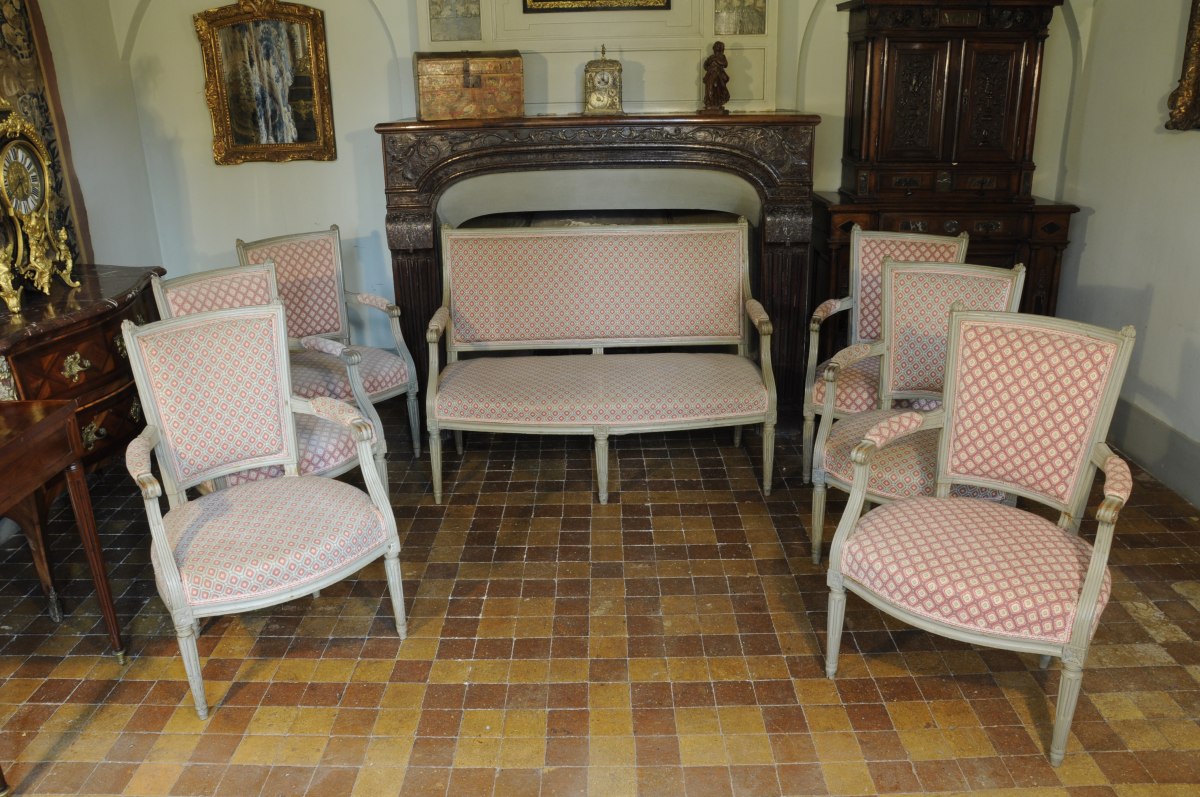 MOBILIER de SALON en bois mouluré et relaqué; dossiers en cabriolet évasé, accotoirs et pieds fuselés à cannelures rudentées.