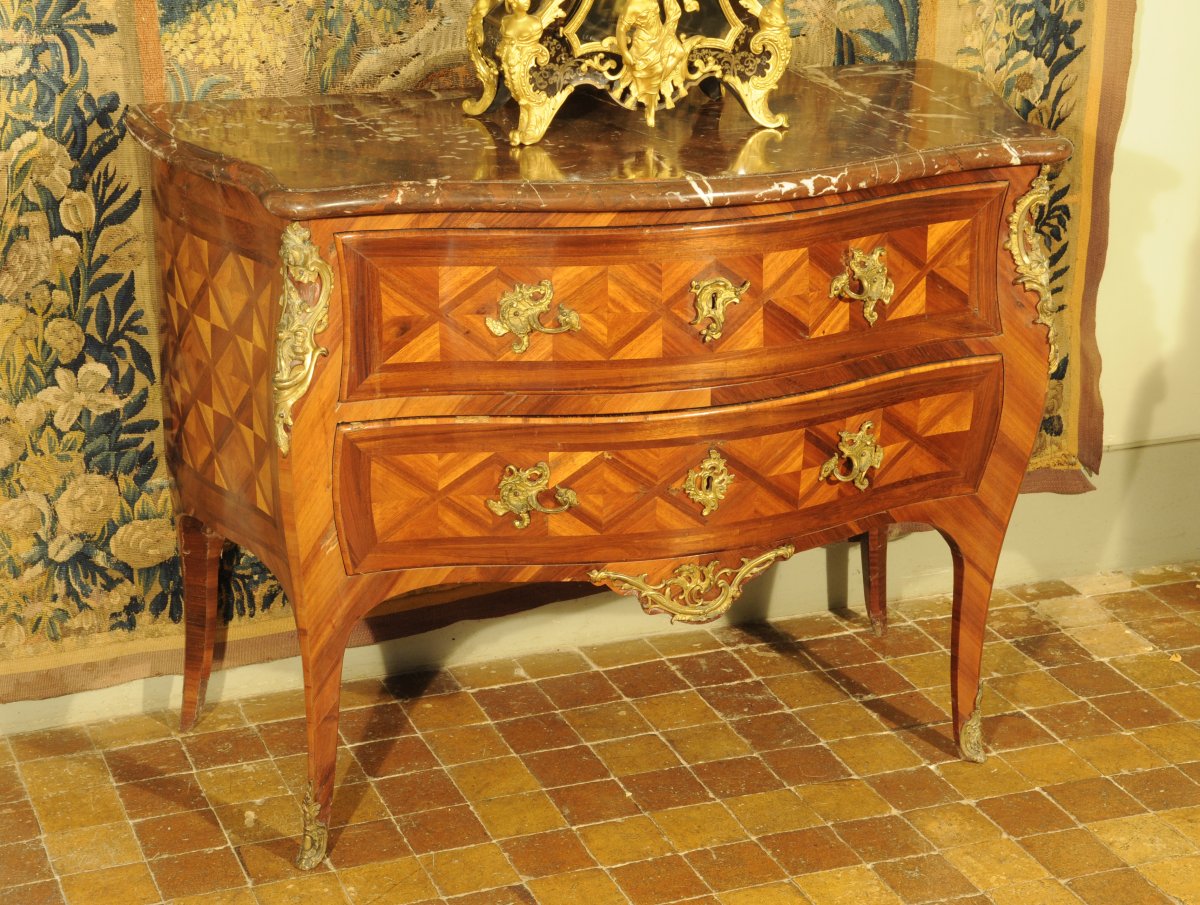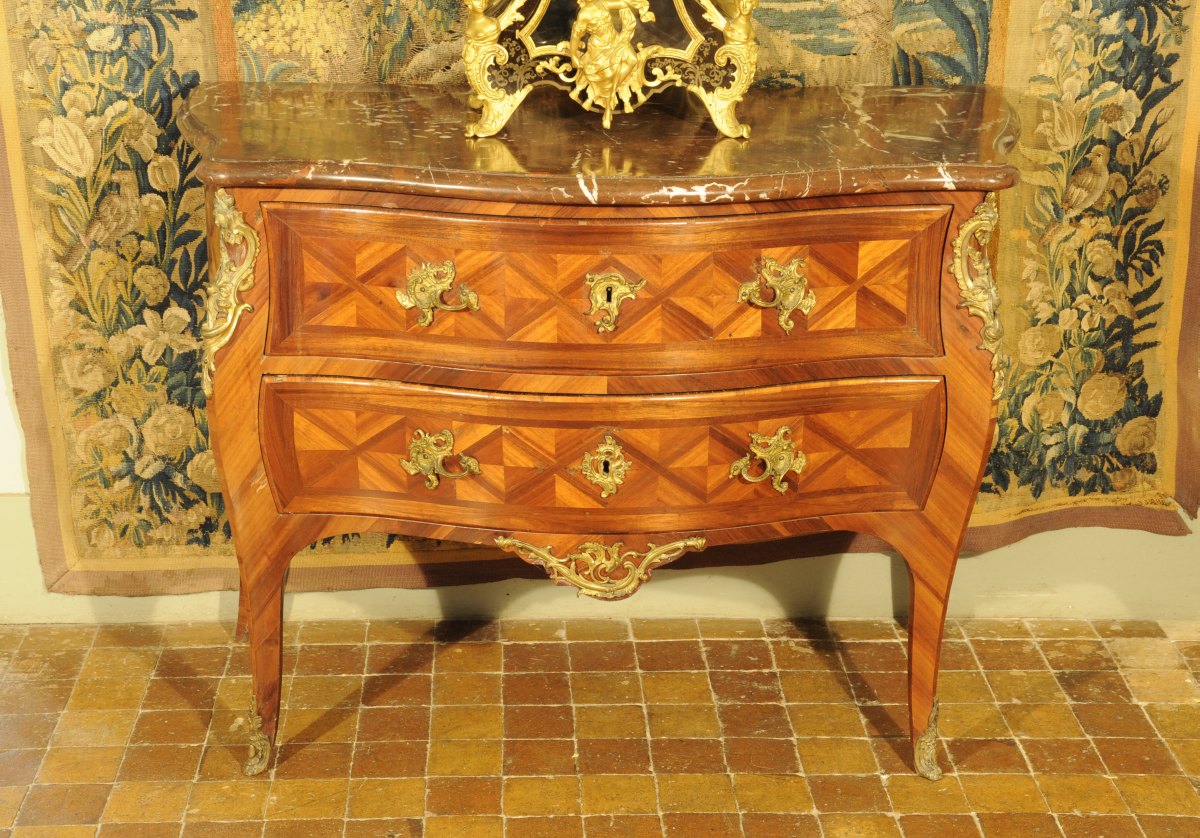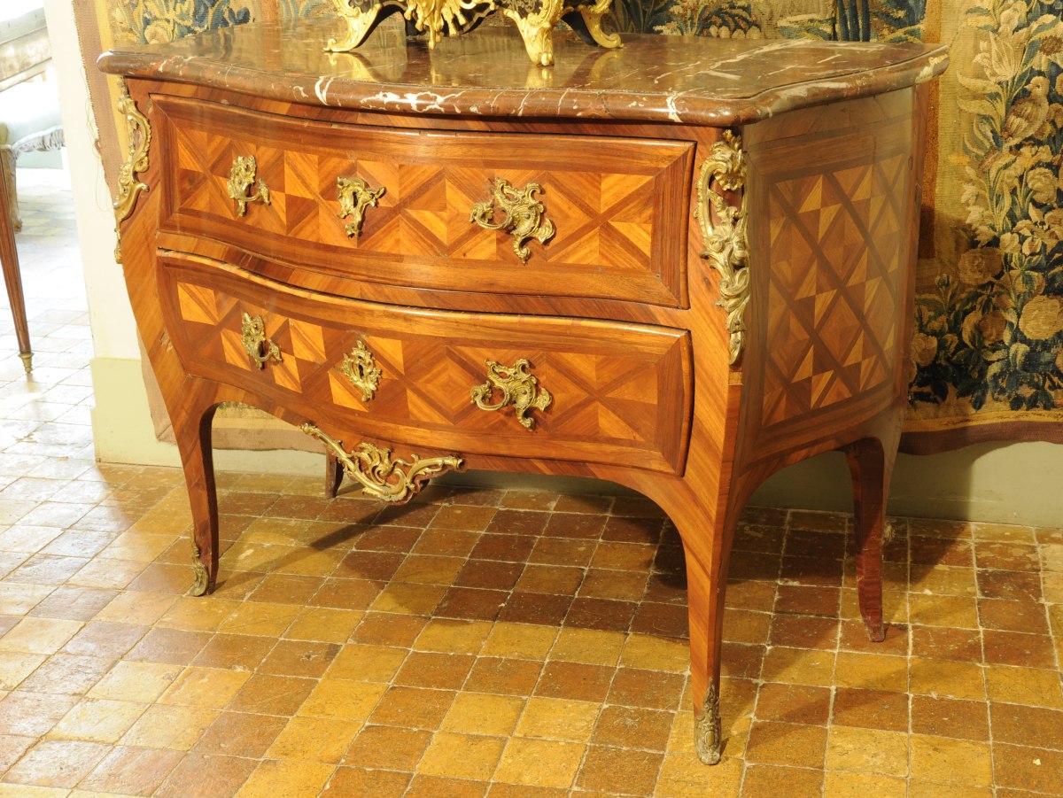 COMMODE en placage de bois de violette et satiné, marqueté de croisions dans des encadrements; façade et côtés galbés sur pieds cambrés. Elle ouvre à deux tiroirs. Garniture en bronze ciselé et doré : poignées, entrées de serrures, chutes et sabot. Dessus de marbre rouge.