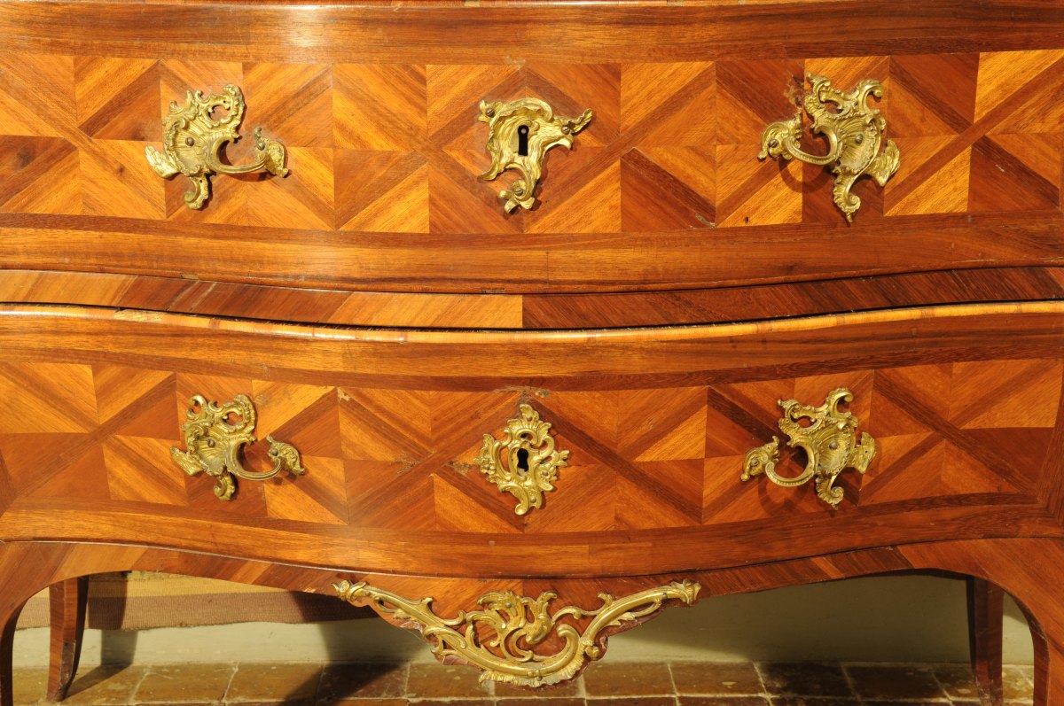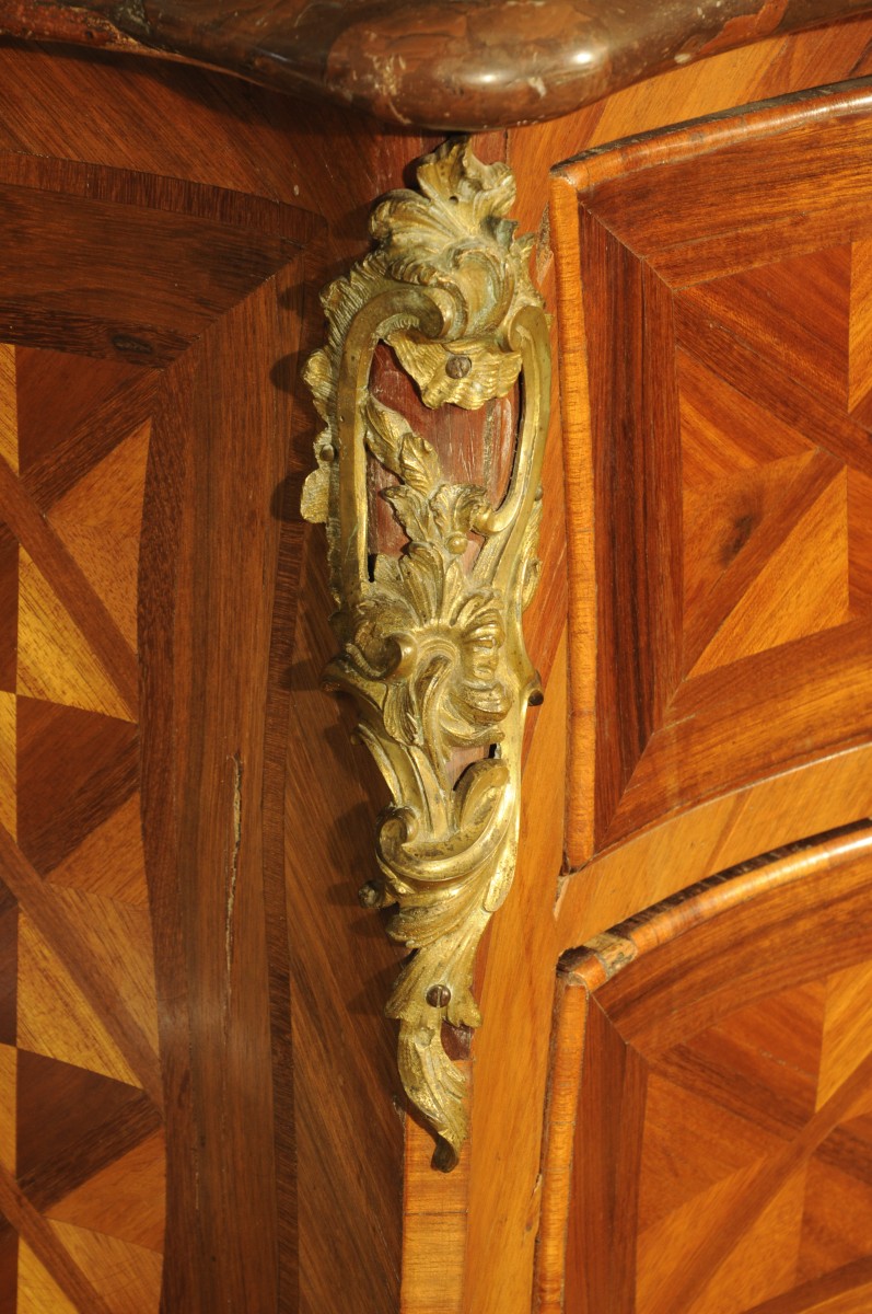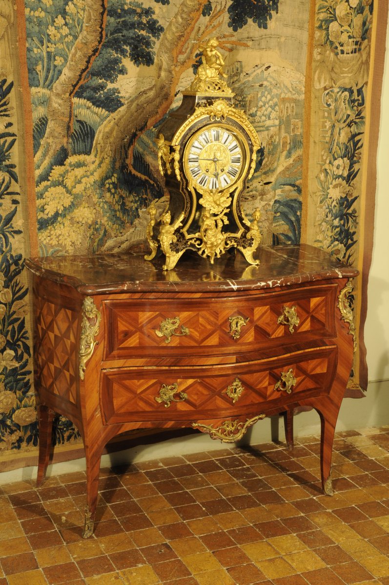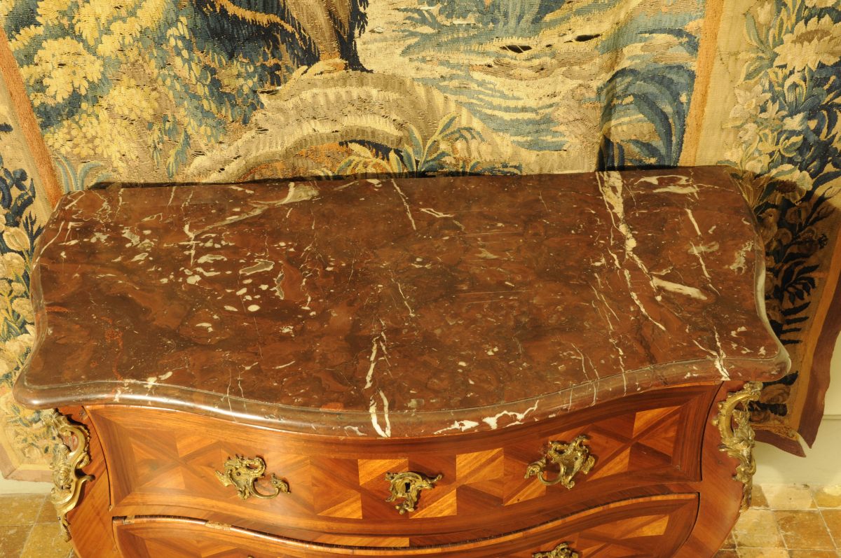 COMMODE en placage de bois de violette et satiné, marqueté de croisions dans des encadrements; façade et côtés galbés sur pieds cambrés. Elle ouvre à deux tiroirs. Garniture en bronze ciselé et doré : poignées, entrées de serrures, chutes et sabot. Dessus de marbre rouge.