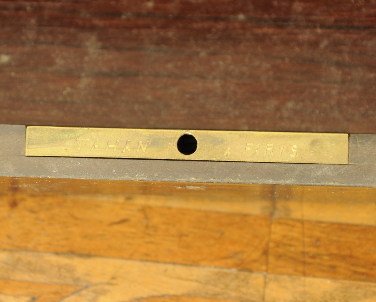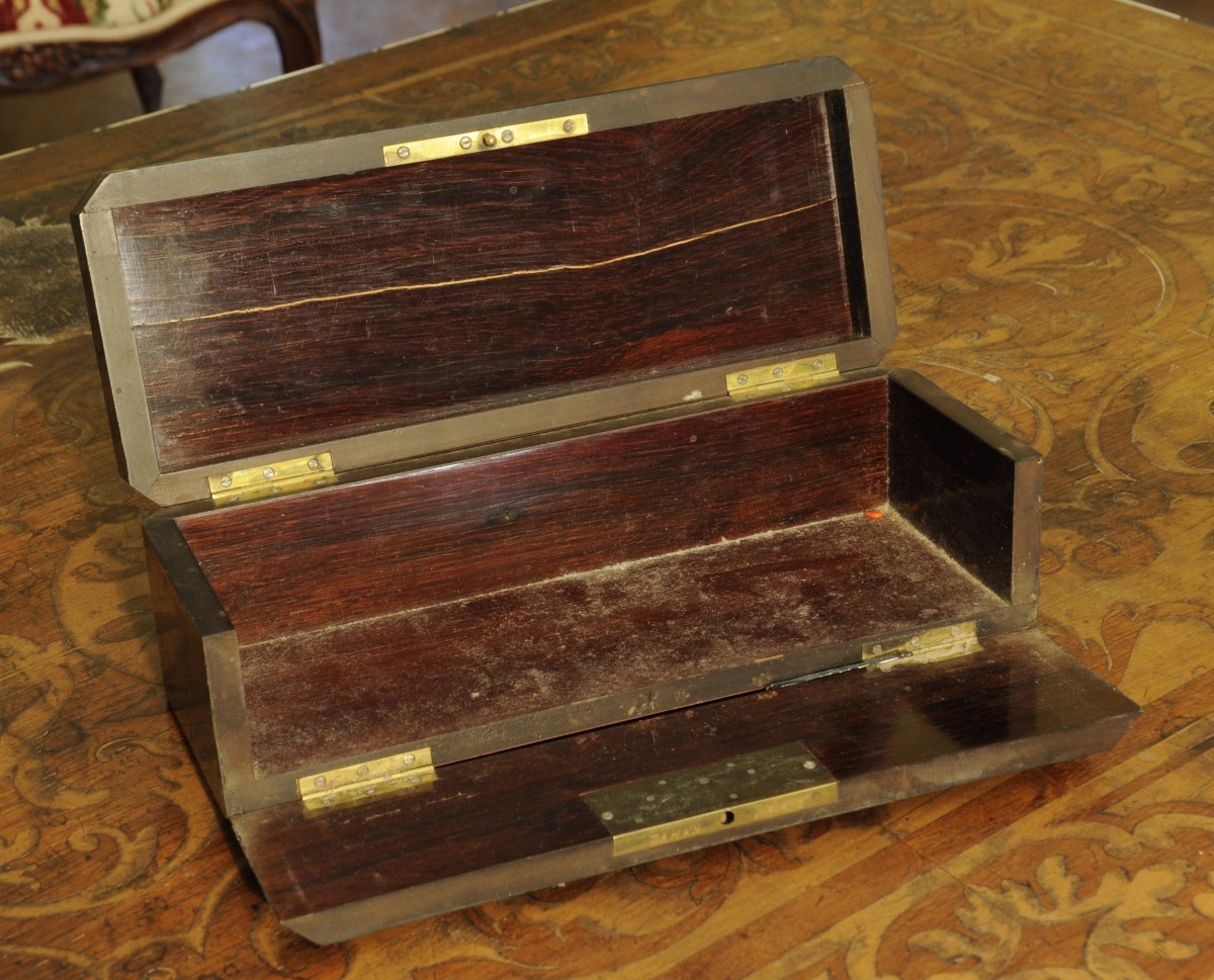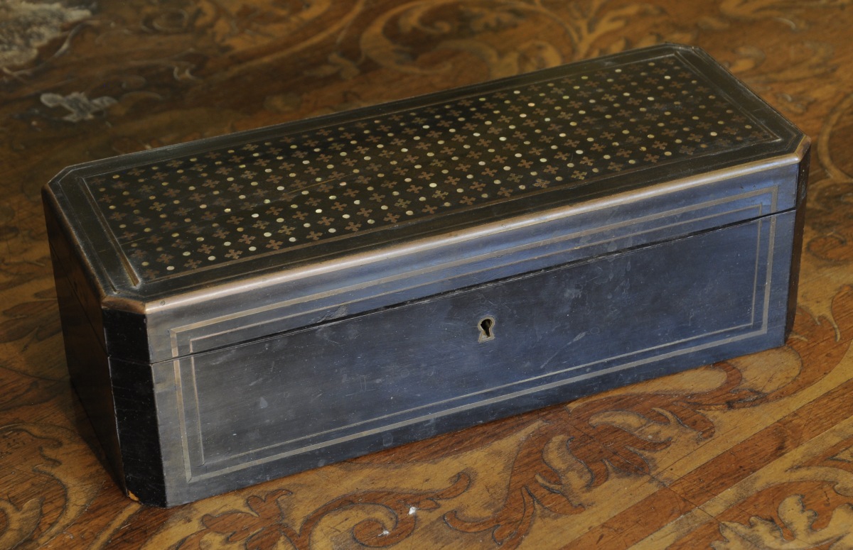 BOÎTE à GANTS de forme rectangulaire, en placage d'ébène à décor incrusté d'étoiles et de points en laiton et nacre. Signé TAHAN à Paris.