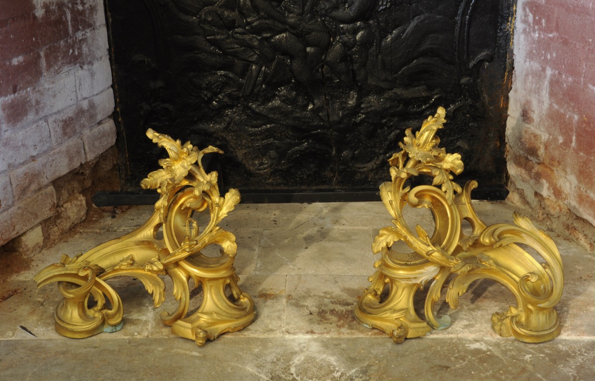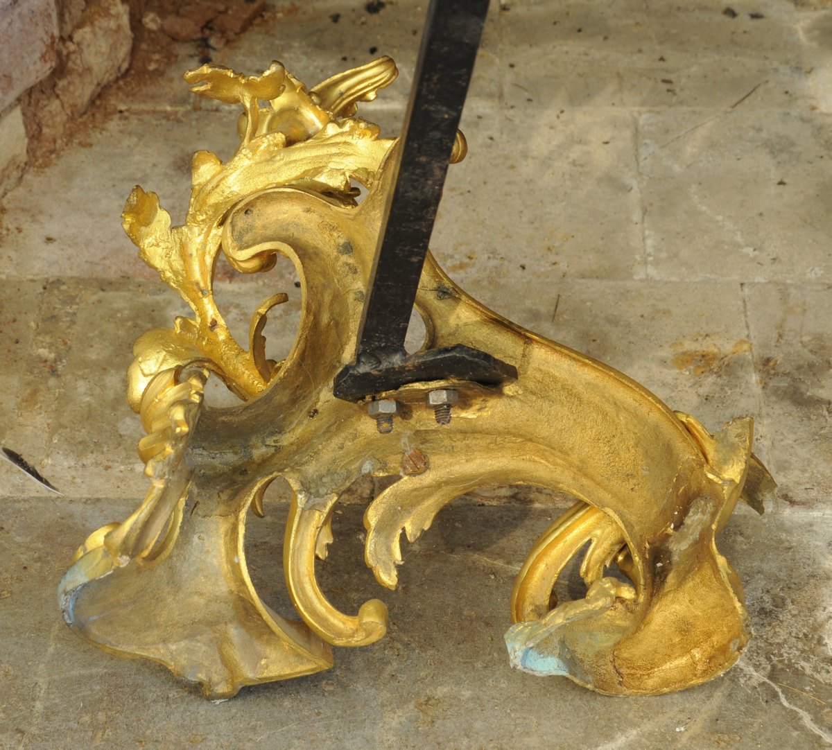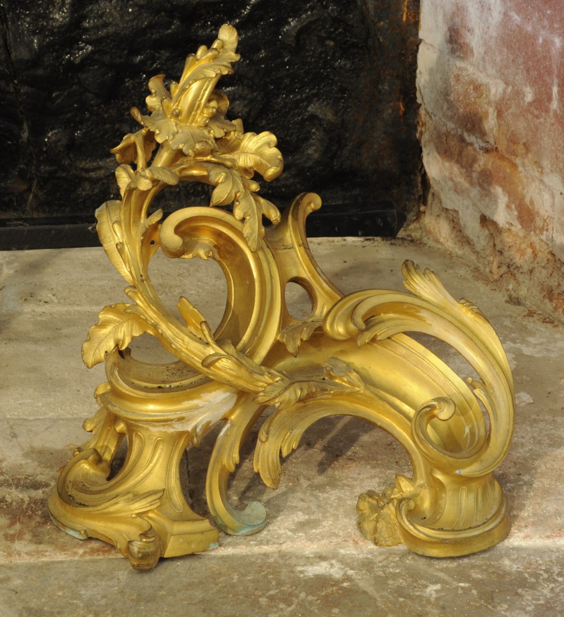 Paire de CHENETS en bronze ciselé et doré, décor rocaille de feuillages.