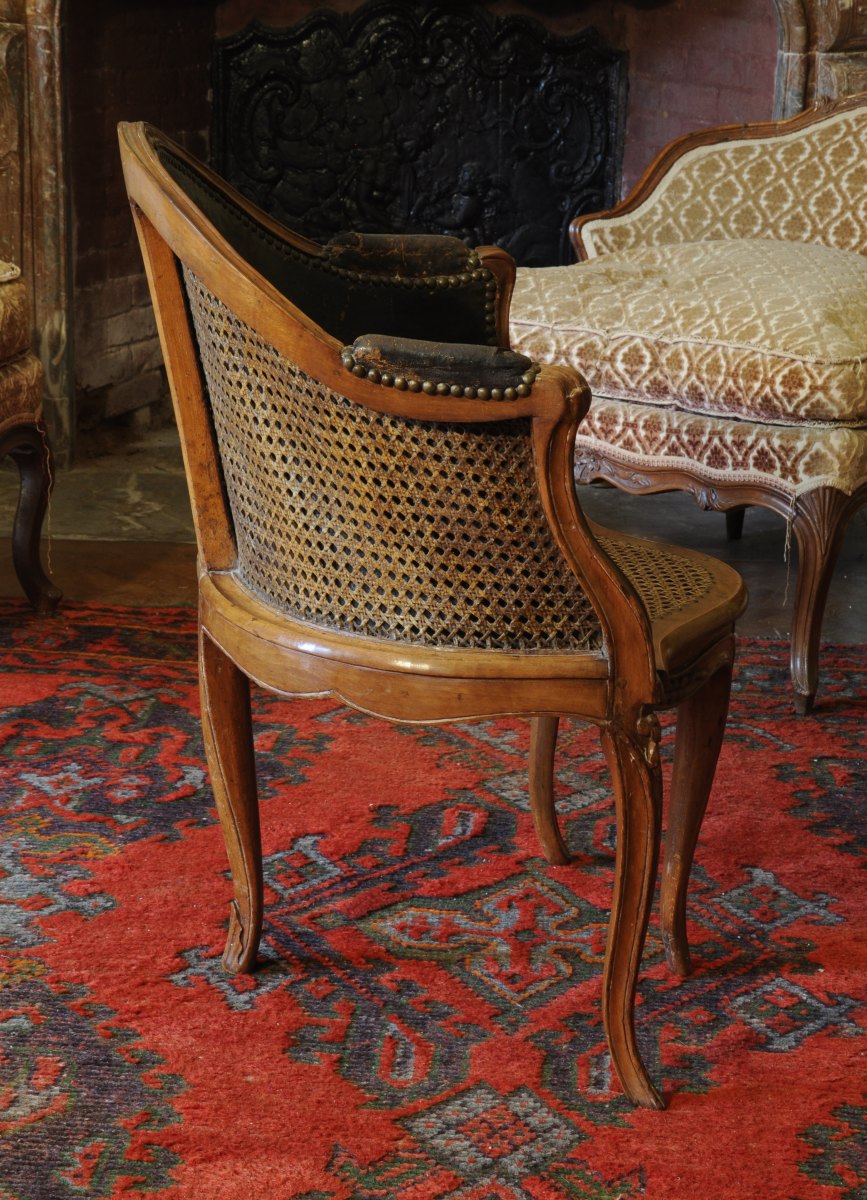 FAUTEUIL de BUREAU canné, en bois naturel mouluré et sculpté de fleurettes; dossier en gondole doublé de cuir, accotoirs cambrés à manchettes gainées de cuir, pieds cambrés.