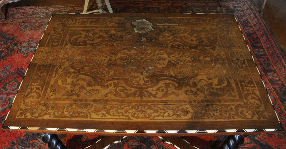 TABLE de milieu en noyer et placage de noyer, en bois noirci; le plateau est marqueté de rinceaux feuillagés dans des encadrements, et bordé d'une frise marquetée d'ivoire et de bois. Pieds en bois noirci réunis par une entretoise en X. Elle ouvre à un tiroir en ceinture.