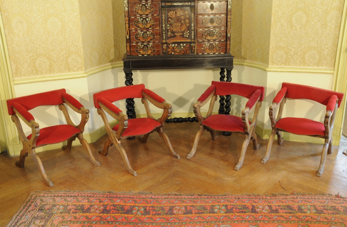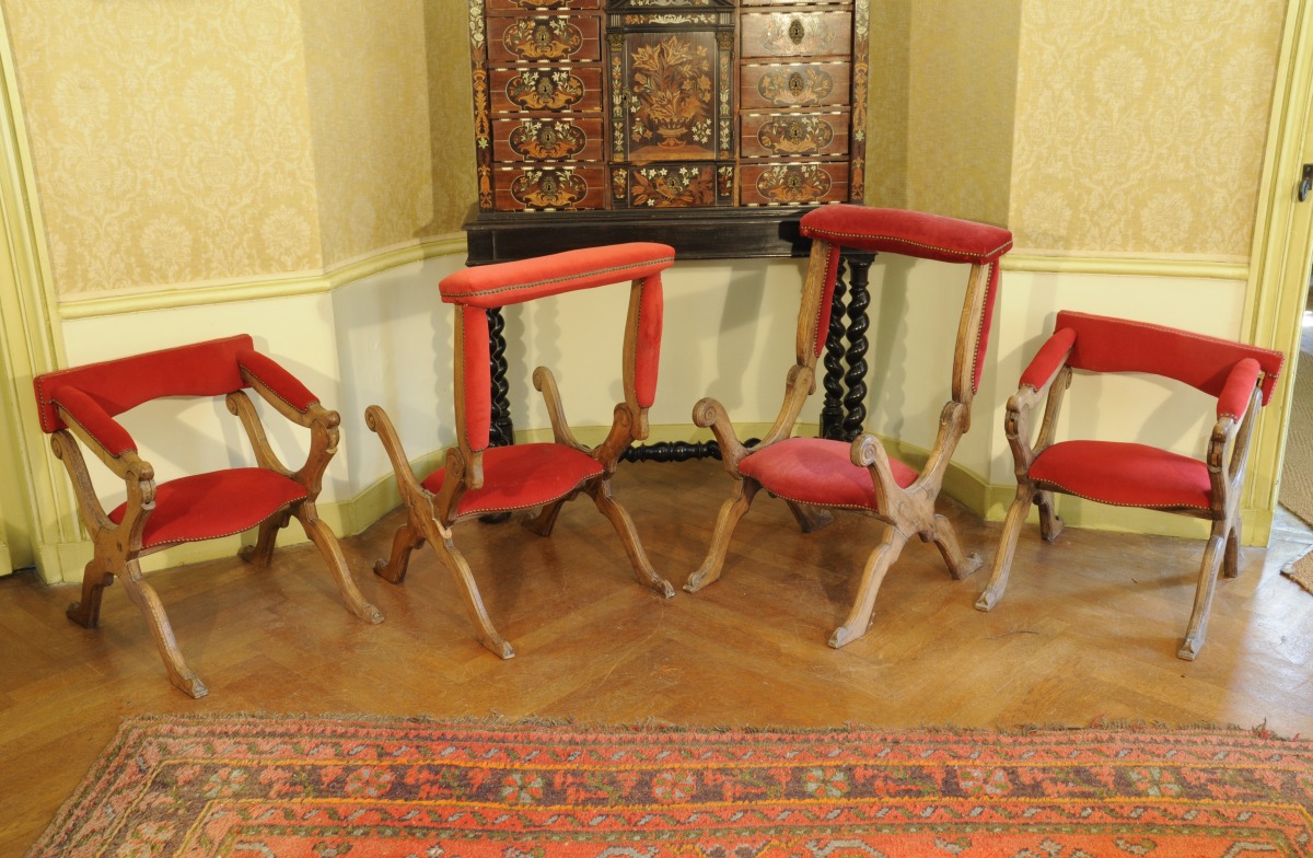 Quatre FAUTEUILS transformables en prie-Dieu, "pieuses" ou "ployants d'église" en chêne mouluré, dossiers à bandeau se relevant pour former accoudoir de prie-Dieu, accotoirs mobiles et pieds en X.