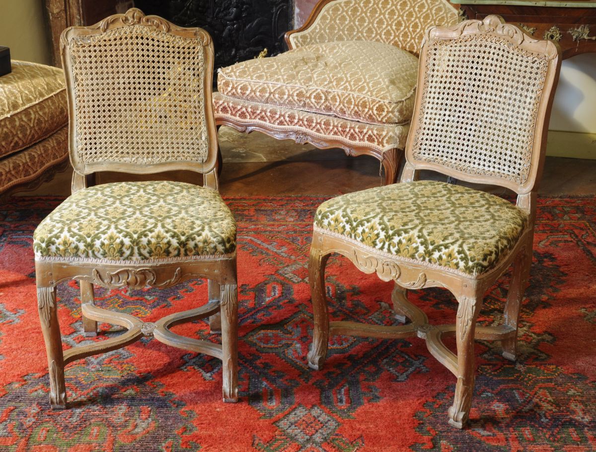 Paire de CHAISES en bois naturel mouluré, sculpté de coquille, rinceaux et de feuilles d'acanthe ; dossiers droits cannés, et pieds cambrés à enroulement, réunis par une entretoise en X.