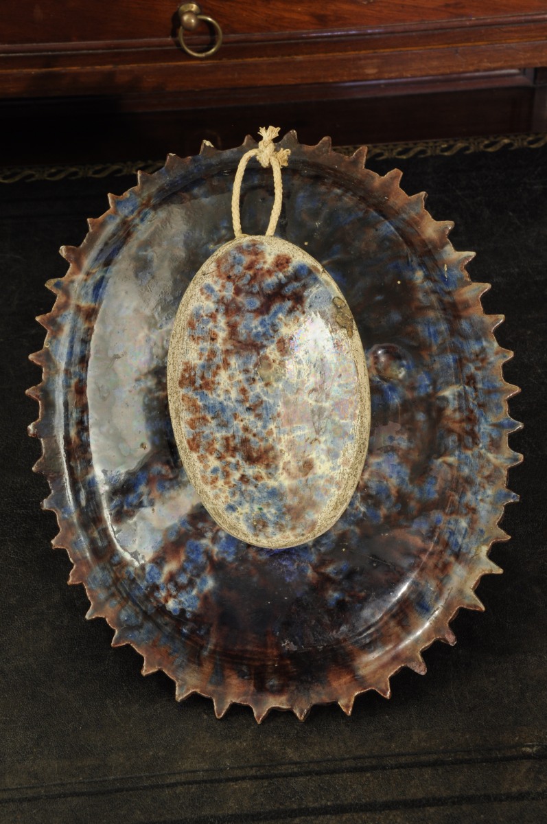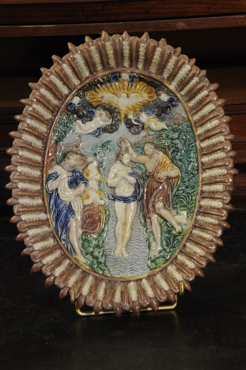 COUPE OVALE à talon, en terre cuite à décor en relief glaçure : Baptême du Christ.