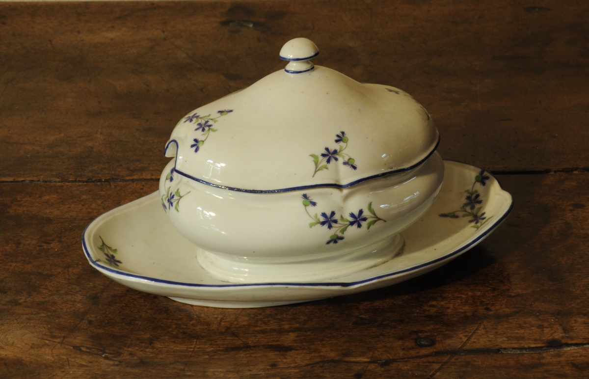 SAUCIÈRE couverte à plateau, en porcelaine, décor au "barbeau".