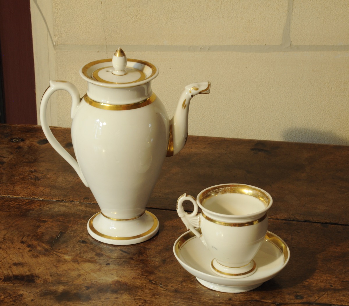 LOT en porcelaine blanche à filet or : cafetière et tasse à déjeuner.