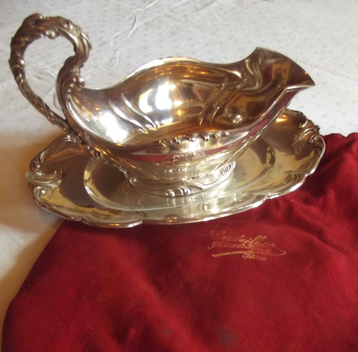 Cette saucière fait partie d'un service réalisé pour Georges, baron Marcotte de Sainte-Marie, officier de marine, mort au champ d'honneur à Dixmude en 1914, qui épousa en 1897 Marie-Madeleine Barry.