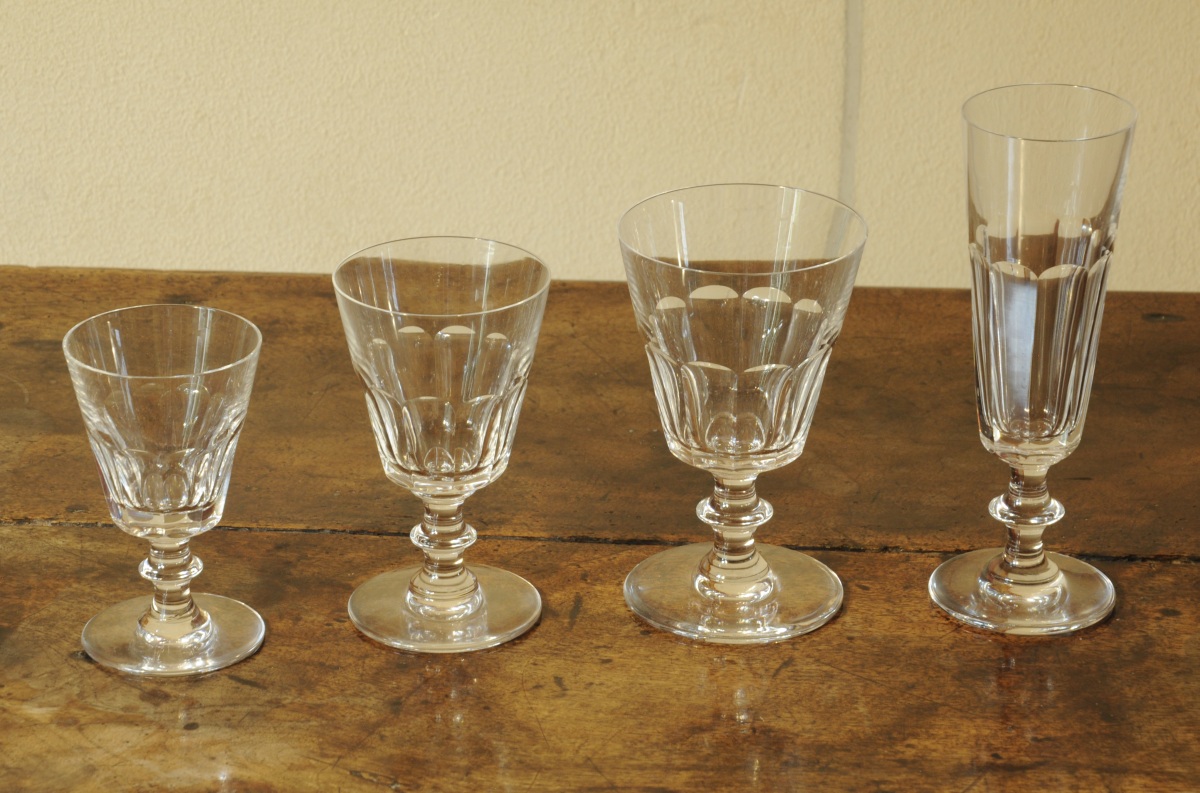 Il comprend : 18 verres à eau, 20 verres à vin, 19 petits verres, 17 flûtes, 4 carafes.