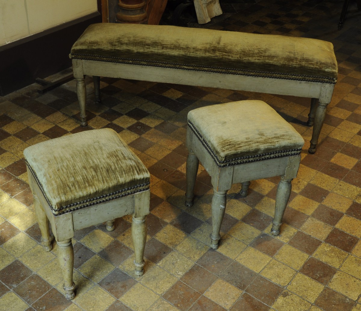 Paire de TABOURETS et une BANQUETTE en bois relaqué gris ; pieds de forme balustre.