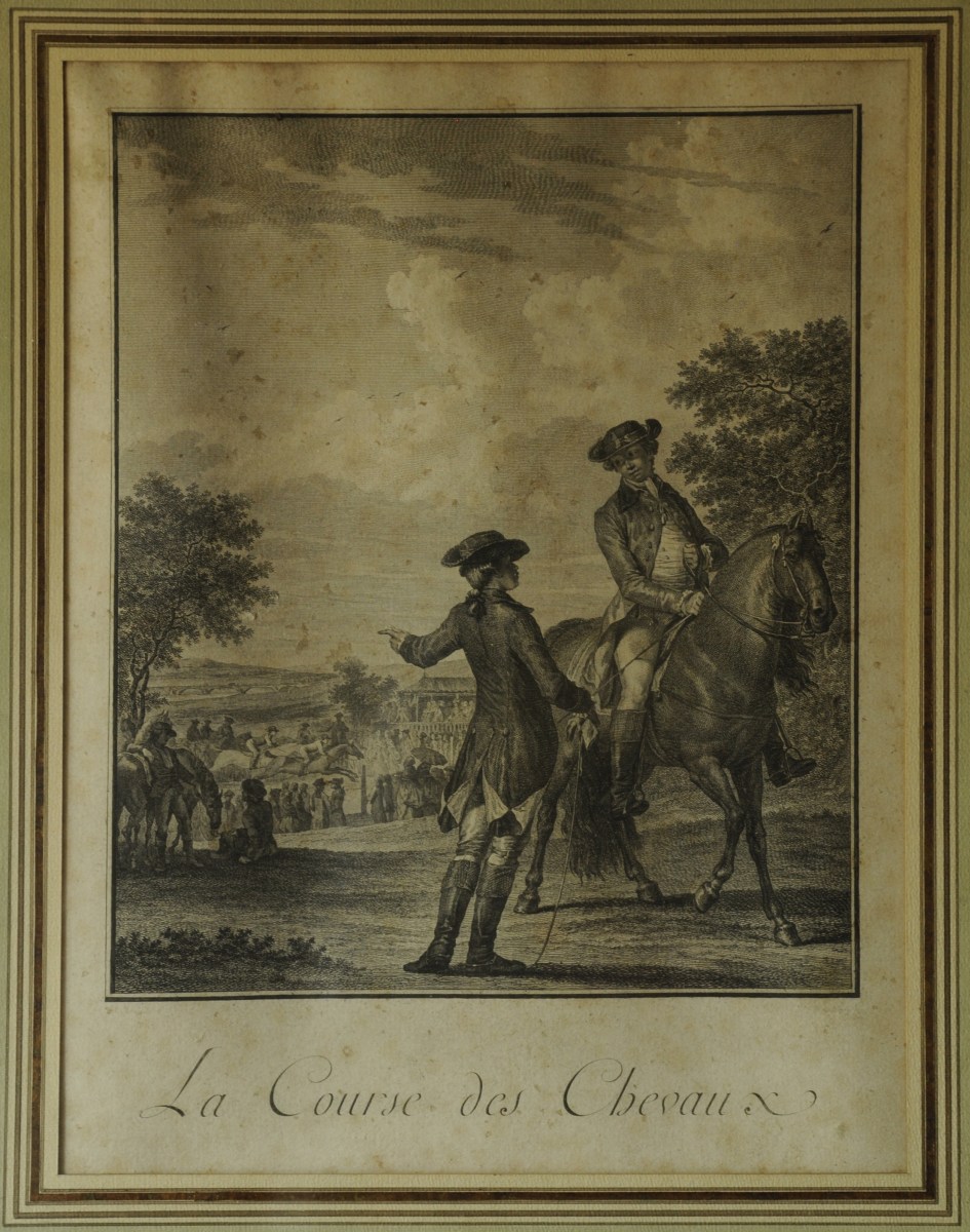 "La Course des Chevaux"Gravure.Cadre baguettes sculptées et dorées.