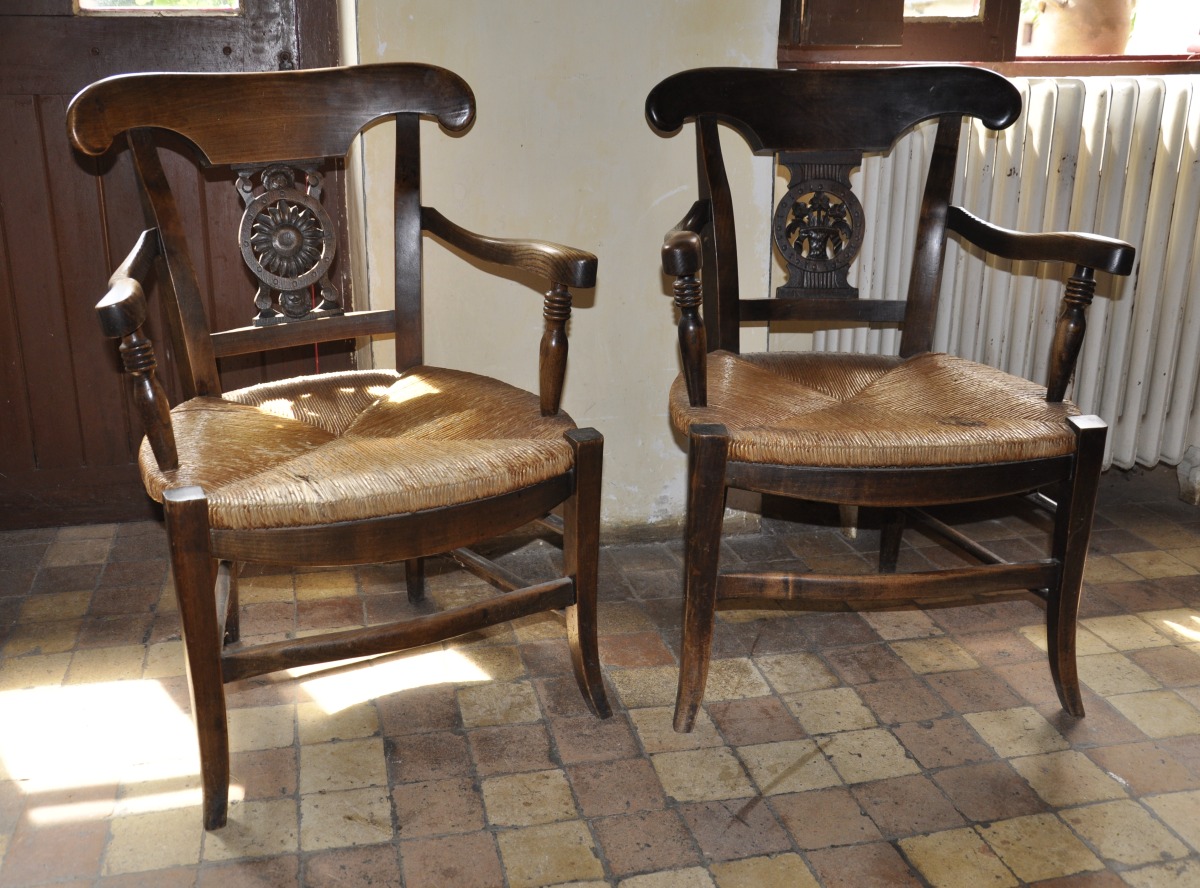 Paire de FAUTEUILS rustiques, en bois naturel, dossiers à bandeau à panier fleuri, assise paillée, pieds à traverses.