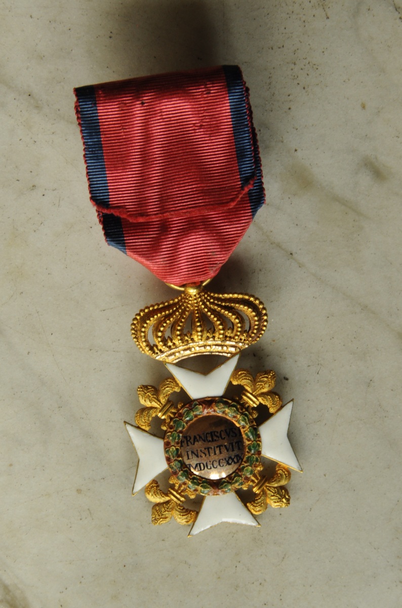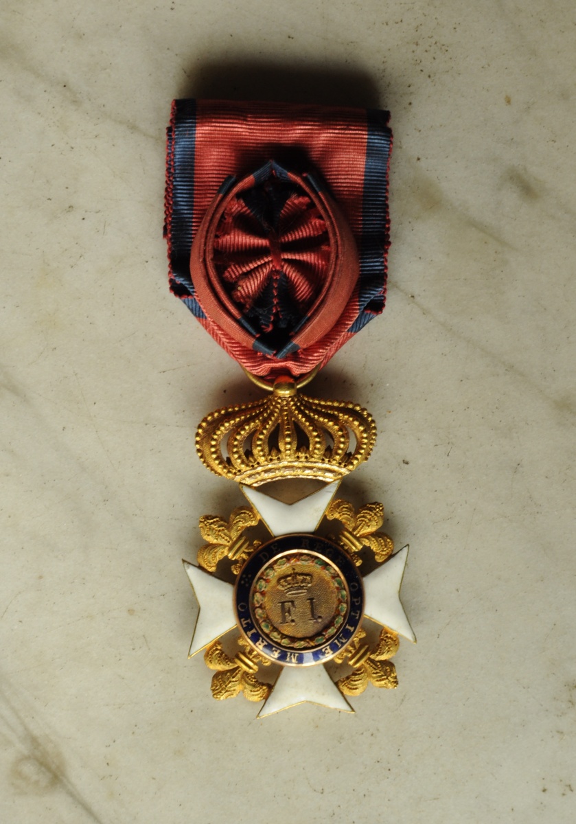 Royaume des Deux-Siciles - ORDRE ROYAL DE FRANÇOIS Ier, croix de chevalier en or et émail (infimes éclats de surface à quelques pointes), centres en plusieurs parties, couronne fixe, ruban orné d'une rosette elliptique non réglementaire. Facture napolitaine.