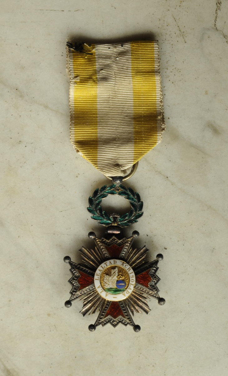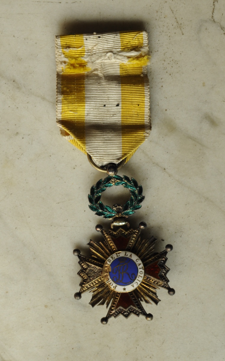 Royaume d'Espagne - ORDRE ROYAL ET AMÉRICAIN D'ISABELLE LA CATHOLIQUE, fondé en 1815, croix de chevalier, en vermeil et émail, les centres en or (éclats au centre et à une branche latérale au revers), ruban.