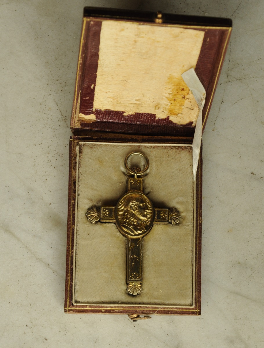 Saint-Siège - CROIX RELIQUAIRE de forme latine en vermeil (?), les extrémités des branches ornées de motifs feuillagés, les bras gravés de motifs floraux et des instruments de la Passion (couronne d'épines, clous, dés, échelle, épée et sur le revers la lance et l'éponge), le centre d'avers présente une relique de la Sainte Croix sous verre, celui du revers un profil à droite du Christ, dans un écrin en maroquin marron, le couvercle uni (manque l'habillage du couvercle).