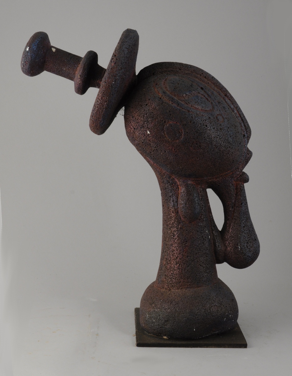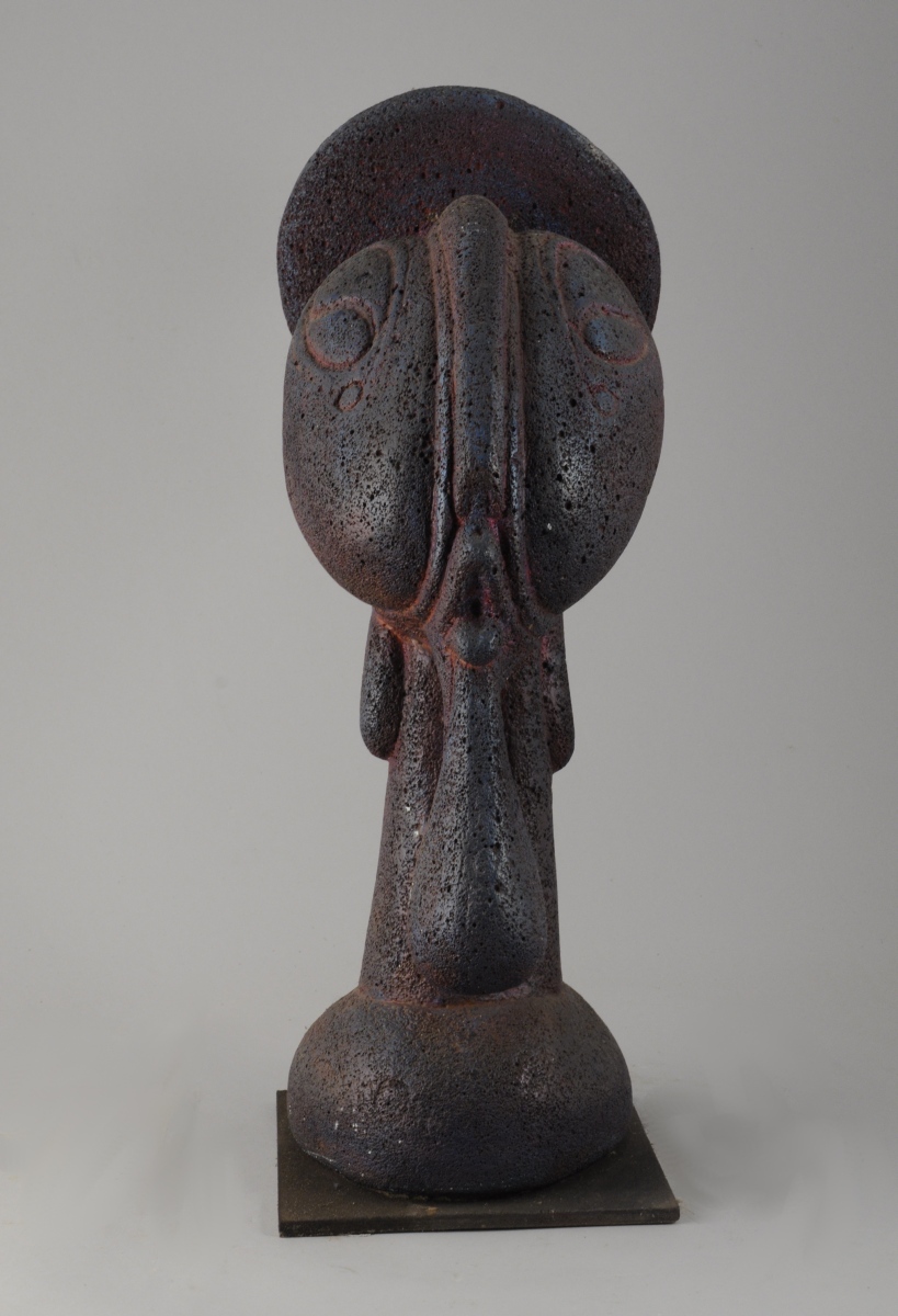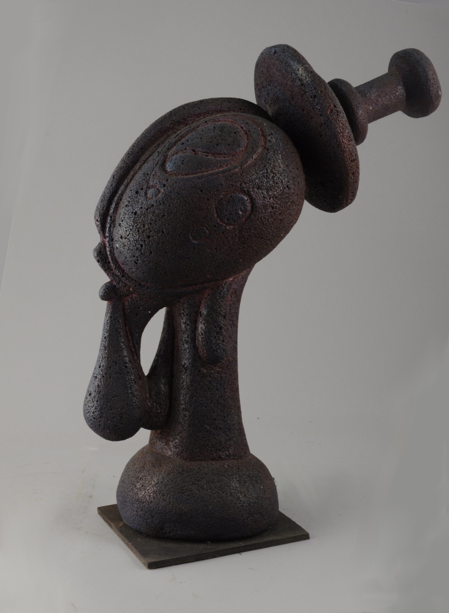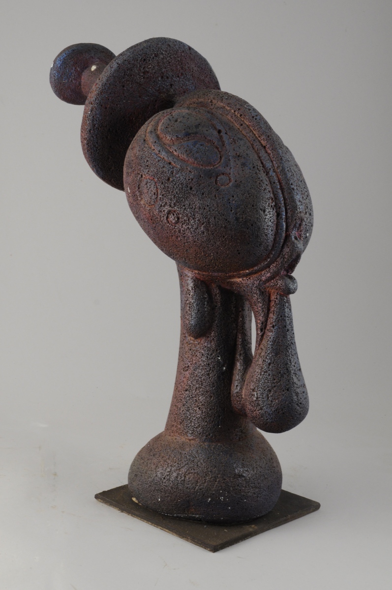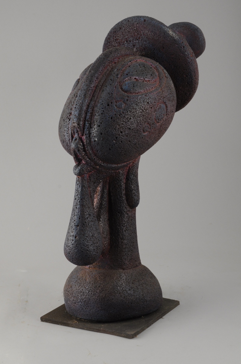 Sculpture en siporex à patine noire, mauve et bleue, reflets métalliques.