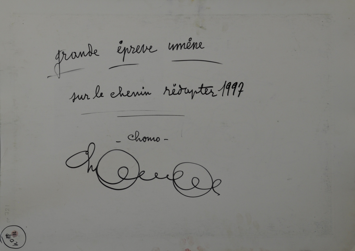 Encrine signée. Contresignée et titrée sur le montage. Contresignée deux fois, datée 1997 et marquée "grande épreuve umène sur le chemin rédapter" au dos.