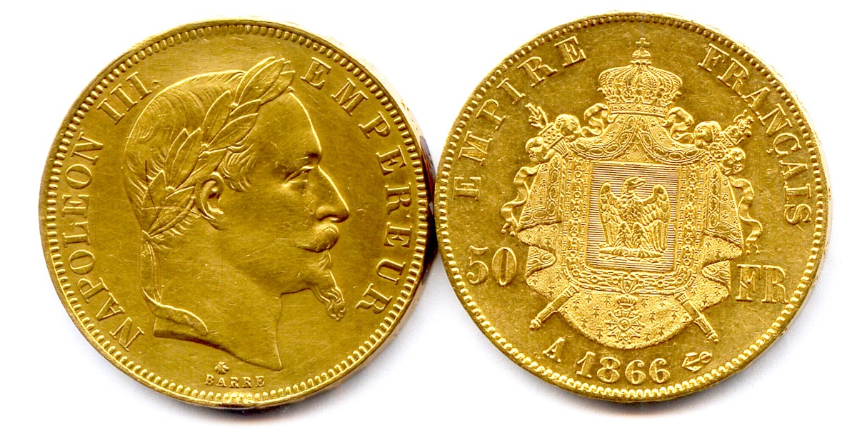 Lot de deux pièces 50 Francs Napoléon III (tête laurée) 1865 et 1866 Paris.
