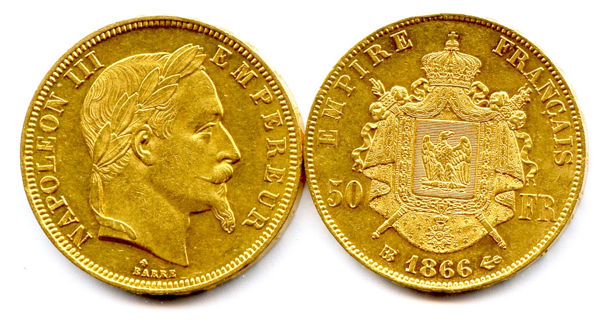 Lot de deux pièces 50 Francs Napoléon III (tête laurée) 1866 Strasbourg. Très beaux.