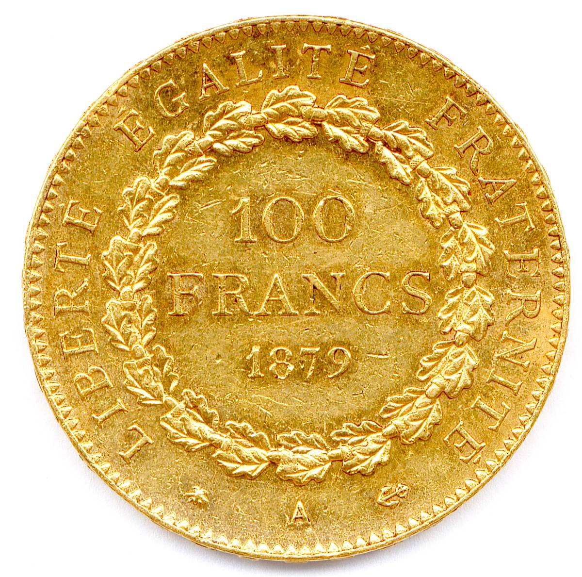 100 Francs or (Dieu protège la France) 1879 Paris. T.B./Très beau.