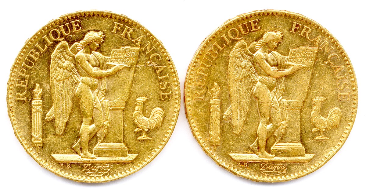 Lot de deux pièces IIIe République : 100 Francs or (Dieu protège la France) 1900 Paris. Très beaux.