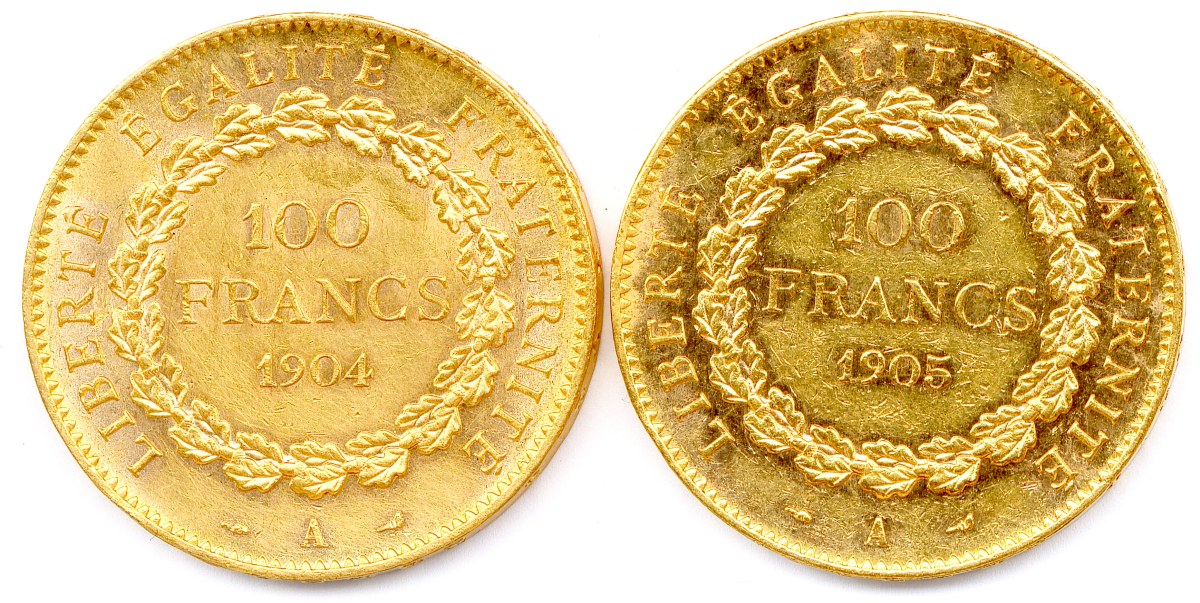Lot de deux pièces IIIe République : 100 Francs or (Dieu protège la France) 1904 et 1905 Paris. Très beaux.
