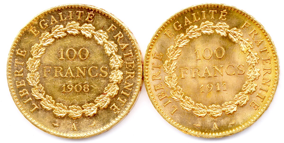 Lot de deux pièces IIIe République : 100 Francs or (L-E-F) 1908 et 1911 Paris. Très beaux.