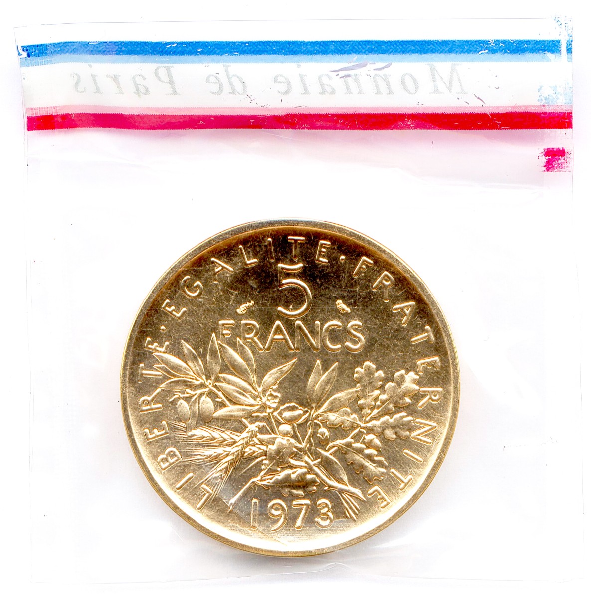 Piéfort en or 5 Francs Semeuse 1973 (38,90g) sous sachet scellé de la Monnaie de Paris.