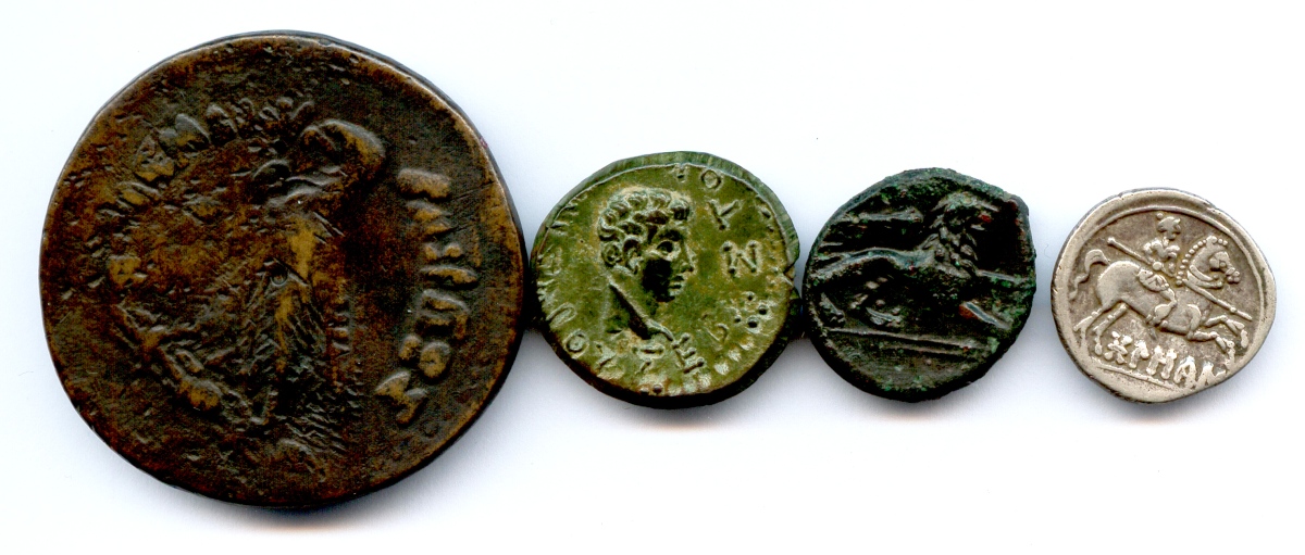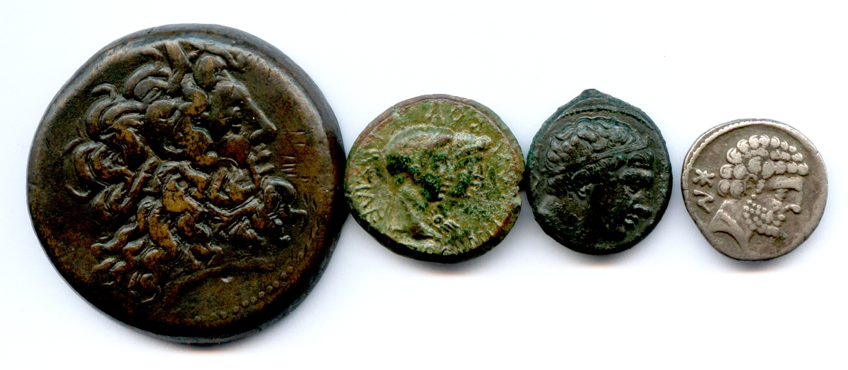 Bronze des Lagide, Bronze (joli patine vert olive) des rois de Thrace sous Auguste Rhoemetalces I (11 av.-12 après J.-C.) & Pythadoris son épouse (rare), Bronze de Sicile Agathoclès (lion et massue), Denier d'argent au cavalier de Huesca.