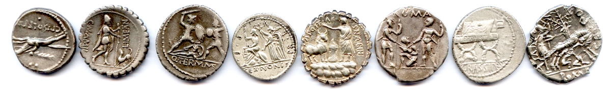 Calpurnia (coursier), Mamilia (Ulysse reconnu par son chien Argos), Minucia (Combat), Nonia (Victoire couronne Rome), Plautia (tête tourelée), Pompeia (Romulus et Remus), Postumia (sacrifice), Veturia (tête de Mars).