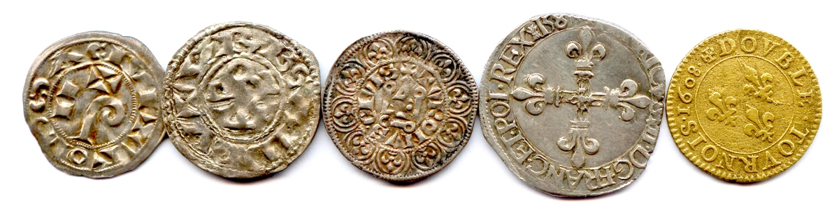 Denier de Raymond VII comte de Toulouse, Denier au monogramme de Foulques pour Geoffroi II (1040-1060) duc d'Anjou, Maille blanche de Philippe IV le Bel (1285-1314), Huitième d'écu d'Henri III (1574-1589), Double tournois (cuivre doré) 1608 d'Henri IV (1589-1610).