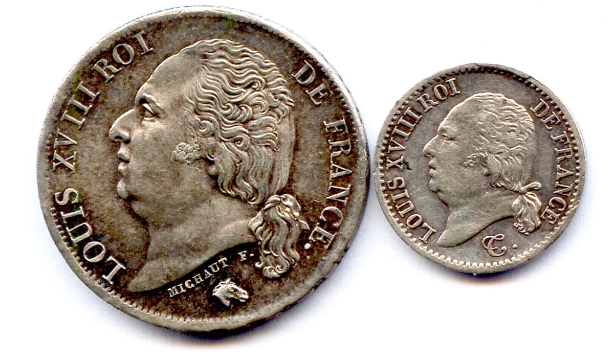 Lot de deux monnaies d'argent Louis XVIII (1815-1824) : Franc 1824 Lille et Quart de franc 1818 Paris.